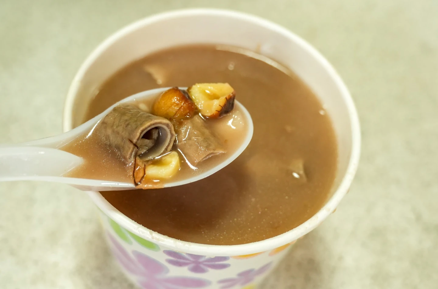 而招牌「四神湯」更是老饕必點。隨著中藥材成本上漲,不少店家改用大量薏仁取代藥材,但薏仁其實並非「四神」之一,「妙口」依舊遵循傳統配方,以山藥、蓮子、茯苓、芡實為主角,搭配豬腸與少量薏仁,以大骨湯慢火熬煮,還特別選用帶皮蓮子,讓湯頭呈現溫潤的蓮藕色澤,入口濃稠順口、藥材香氣厚實,尾韻回甘;豬腸處理得乾淨Q彈,不軟爛,真材實料喝得出來。