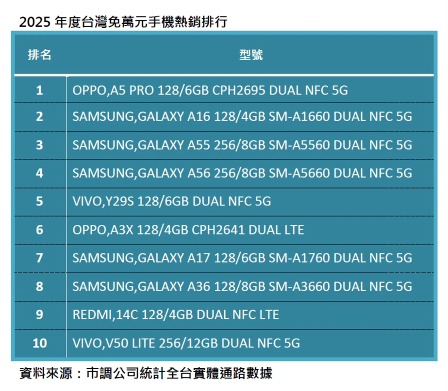 【記者吳珍儀/台北報導】農曆春節期間向來是國內消費市場的重要檔期,隨著換機需求升溫,價格親民的入門與中階智慧型手機銷售表現持續增溫。通路與市調資料顯示,2025年台灣萬元以下手機銷售以三星、OPPO、vivo及紅米等品牌為主力,反映消費者在通膨壓力與理性消費趨勢下,更傾向選擇兼顧價格與效能的機型。