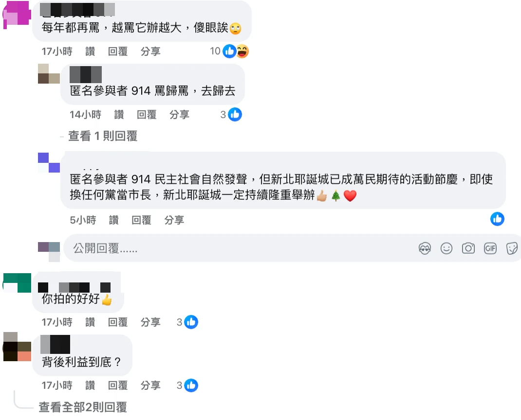 有網友則給予支持「民主社會自然發聲,但新北耶誕城已成萬民期待的活動節慶,即使換任何黨當市長,新北耶誕城一定持續隆重舉辦」、「除了假日或辦演唱會時當然車多造成不便,平常日對交通造成的影響根本還好。」、「帶動人流商流金流的板橋,對於資產的增值,有加分的效果 !」