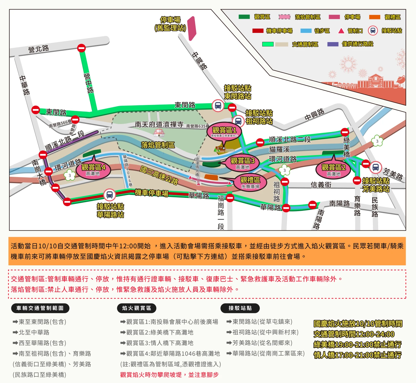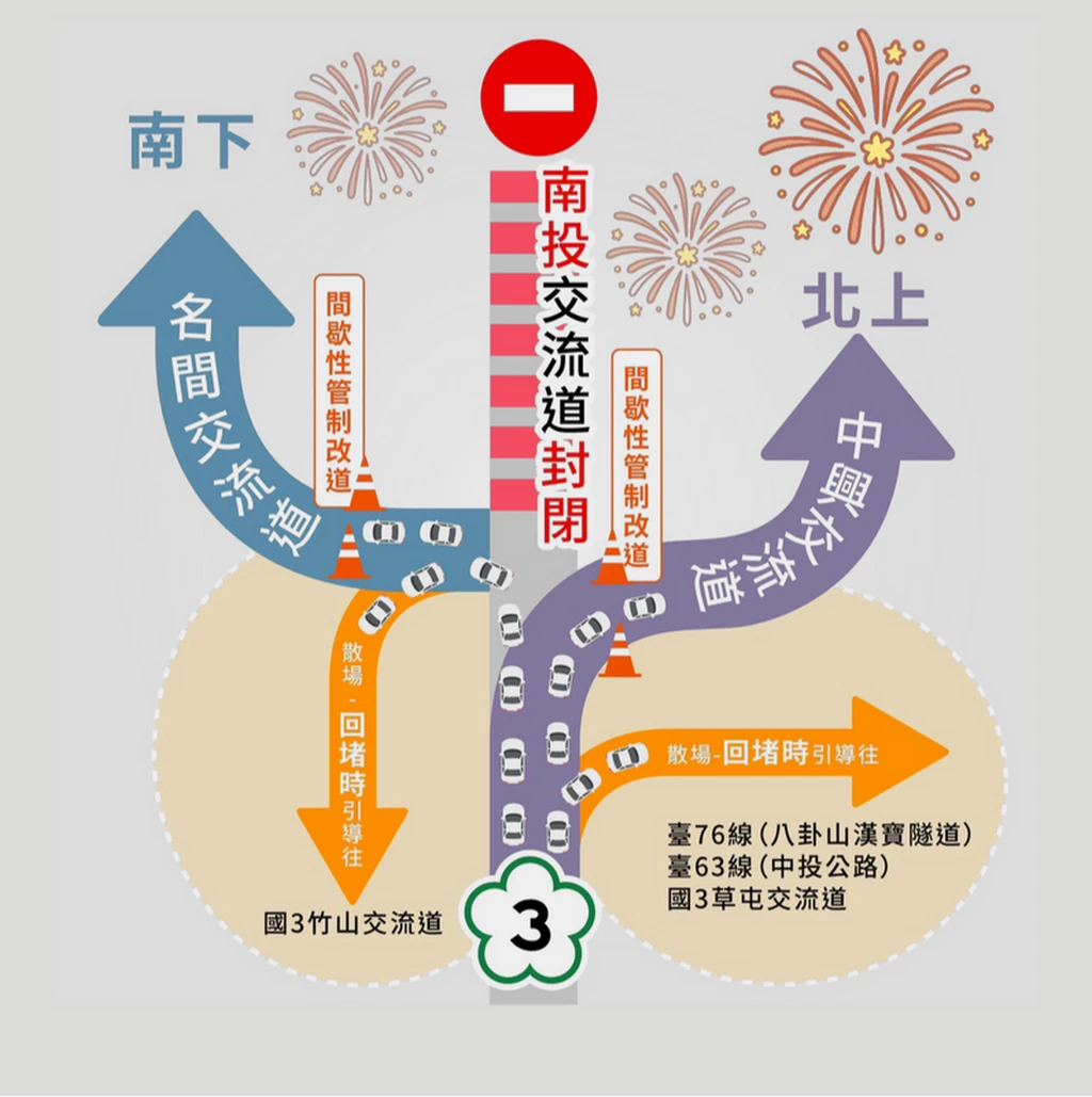 南投縣府規劃, 10月10日中午12時至晚間24時,國3南投、中寮交流道封閉,北部民眾改走國3草屯、中興交流道;南部民眾改走國3名間交流道;彰化/國1改走台76中興交流道