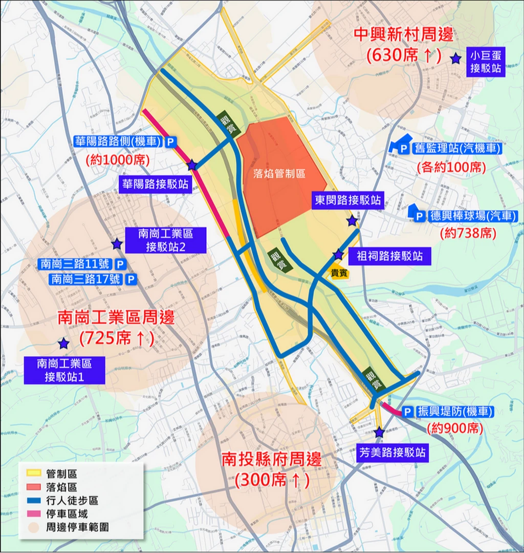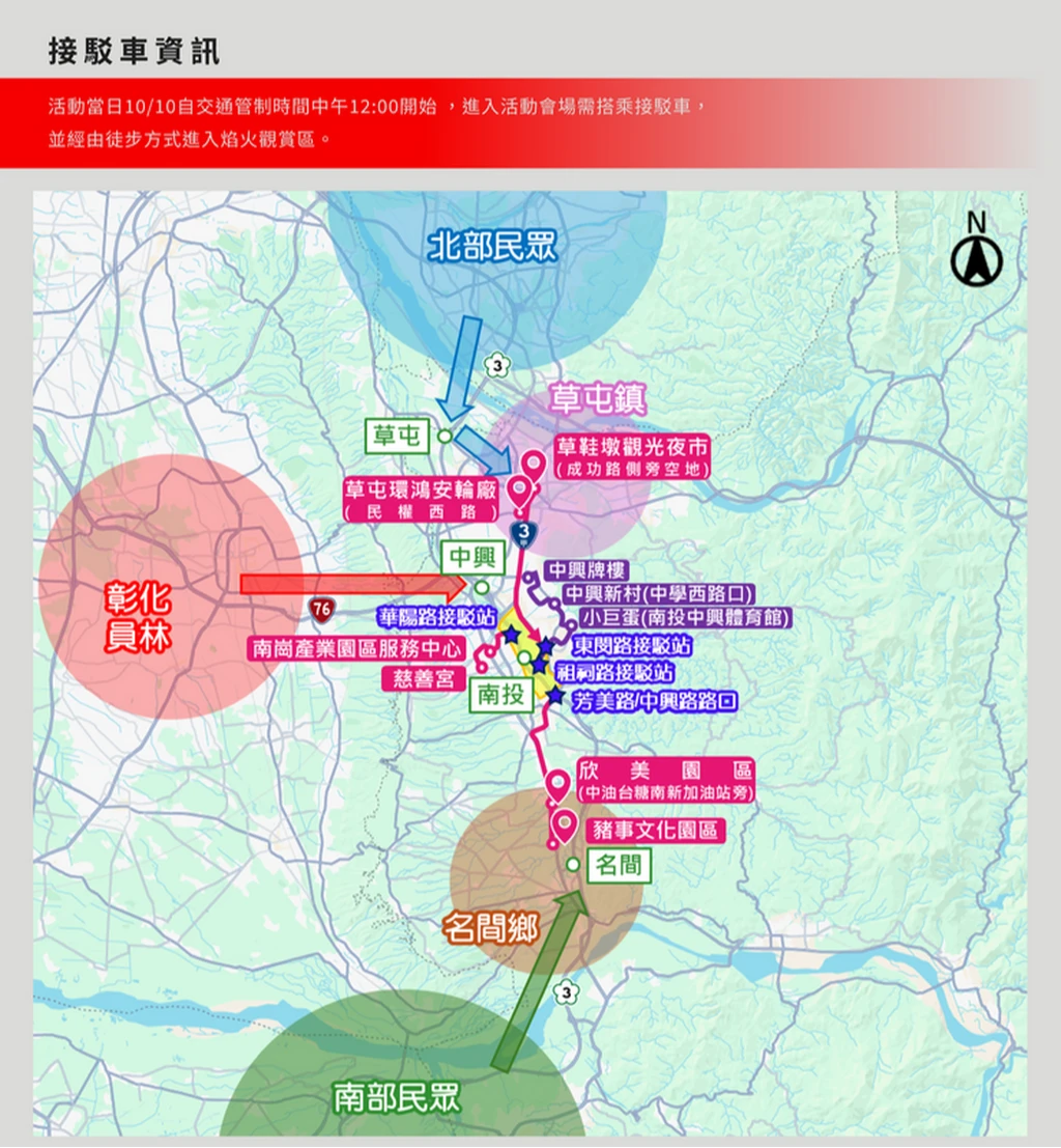 2025國慶焰火,南投縣府規劃,自10月10日中午12時開始,進入會場皆需搭乘接駁車,再徒步進入焰火觀賞區,接駁車去程下午2時開始,末班車6時30分,回程則從晚間8時30分至晚間11時,將視情況調整,整體班距每10到15分鐘一班車。