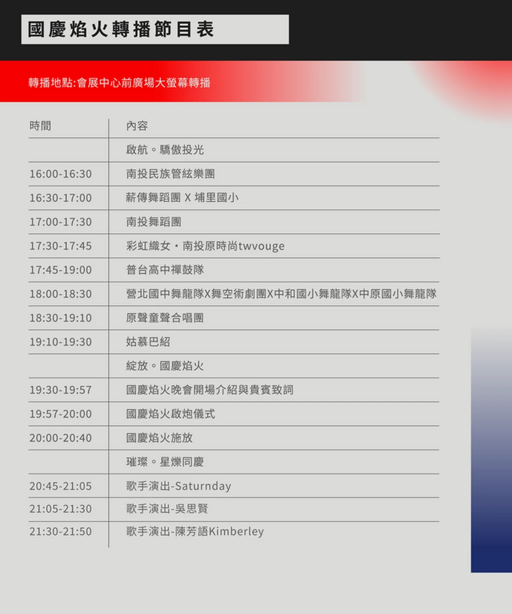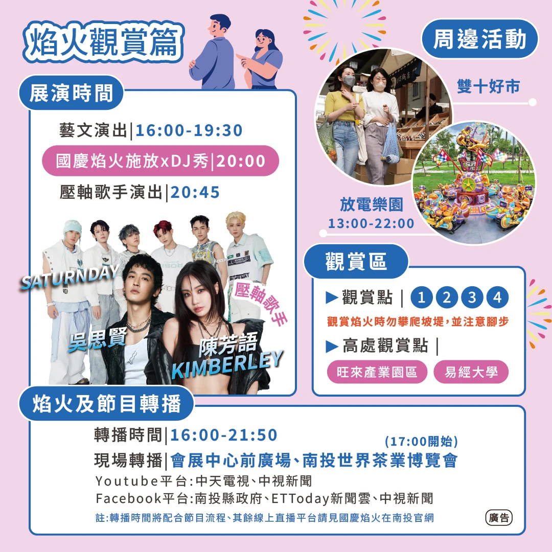 2025國慶焰火在南投,當天下午4時在南投會展中心就有表演,卡司包括36屆金曲獎最佳原住民歌手姑幕巴紹、焰火結束後,還有原子少年Saturnday、吳思賢和陳芳語Kimberlay接連開唱。