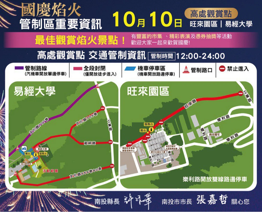 2025國慶焰火南投縣政府設置4個觀賞區, 南投縣會展中心前後廣場、綠美橋下高灘地、情人橋下高灘地、鄰近華陽路1046巷高灘地;另外還設有兩個高處觀賞點,分別是南投市神木村社區/旺來園區跟唯心聖教學院。