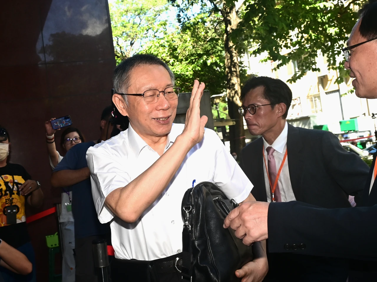柯文哲今天上午抵達法院,大批小草紛紛高喊「阿北加油」,柯文哲露出笑容,一手抱著公事包,另一隻手則和小草揮手示意,看來心情不錯。