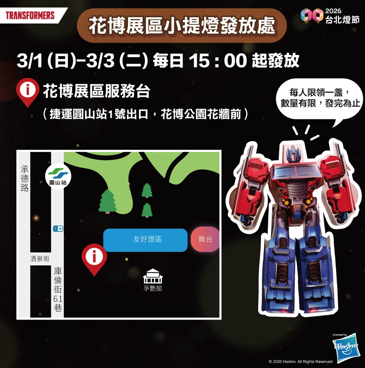 【記者許皓婷/台北報導】「2026台北燈節」2月25日起至3月15日熱鬧登場!其中花博展區首度攜手全球知名IP「變形金剛」,推出限量「柯博文」小提燈,設計呼應變形金剛的機械風格與城市未來感,造型吸睛、外型亮眼,兼具收藏價值與互動樂趣。將於3⽉1⽇⾄3⽇於花博展區及⻄⾨展區開放⺠眾限量領取,並於3⽉1⽇⾄2⽇同步於台北市各⾏政區指定地點發放。