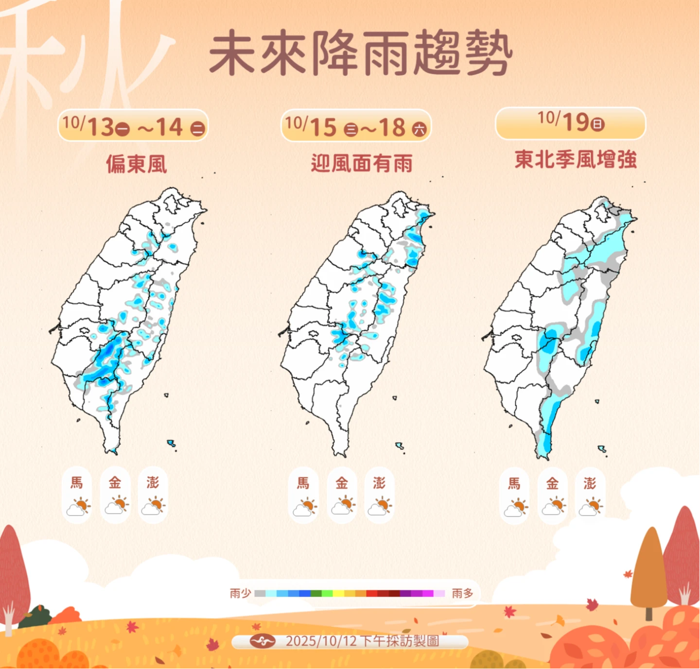 下周日(19日)變天!氣象署說,東北季風南下,北部及東半部氣溫明顯下降,高溫約28至30°C,花東約30至31°C,中南部約32至34°C。水氣增多,北部與東半部易有短暫陣雨,午後中南部也有局部雷陣雨。隨著風勢轉強,各沿海風浪將增大,前往海邊活動或海上作業須注意。