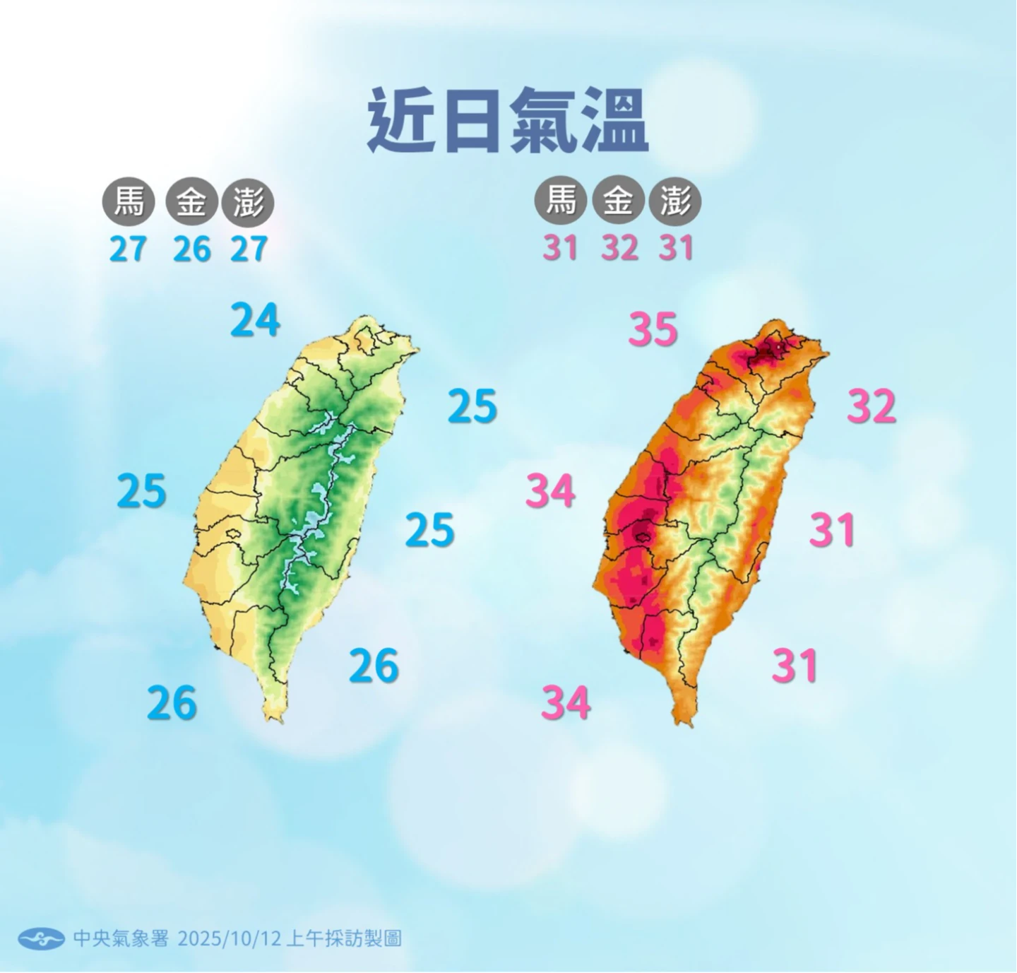 北部及中南部內陸今天可能出現36°C以上高溫,台北、新北、雲林、台南及屏東亮橙色高溫燈號。白天高溫西半部約33至35°C,東半部約31至33°C,澎湖、金門約31至32°C,馬祖約30°C。