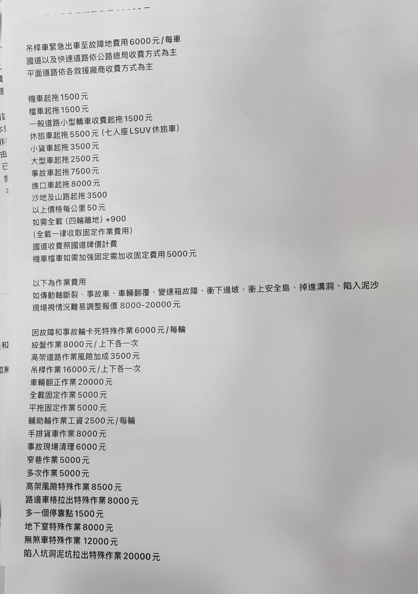 據了解,車主致電後,會由廖女充當的客服接聽,隨後車主會收到報價單,洋洋灑灑十多頁的電子檔,抓準車主沒有心情細看,孰料魔鬼藏在細節裡,某頁條列出收費名目與金額,包括車輛翻正收2萬、啟動吊桿收費1.6萬、陷入泥沙最高收2萬,事故車起拖7500元,不同車種也有不同收費,手排貨車作業就要8000元起跳。