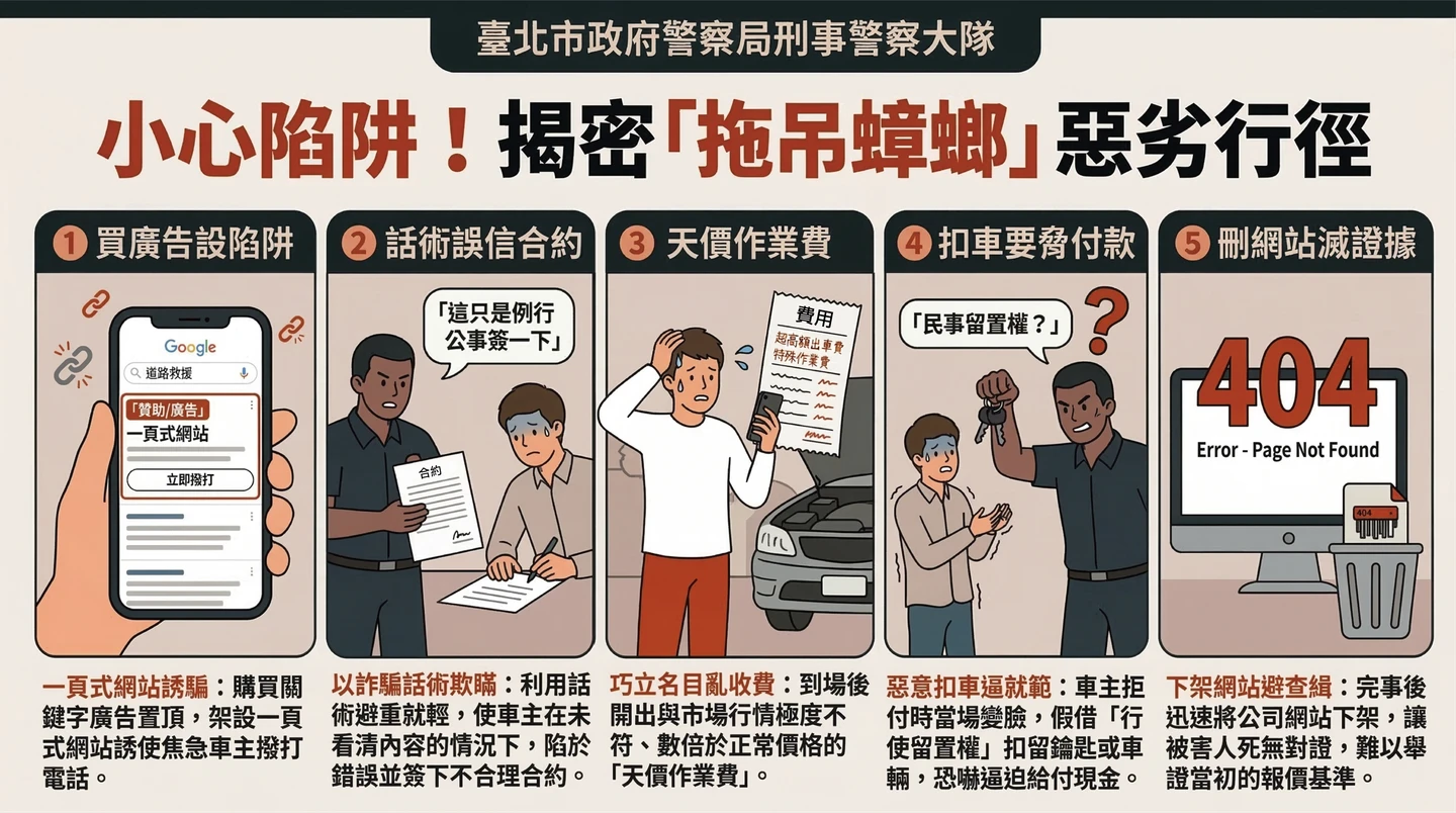 據悉,崔姓男子(33歲)是「小崔拖吊」負責人,與「騰至國際」蔡男及「宇生國際(海東)」許男,共組「拖吊蟑螂」集團,事先購買網路搜尋平台關鍵字廣告,大量投放「專業道路救援」資訊,當車輛故障或發生事故時,車主會優先搜尋到他們的拖吊服務網站,只要致電委託後,最後都會收到天價費用帳單。