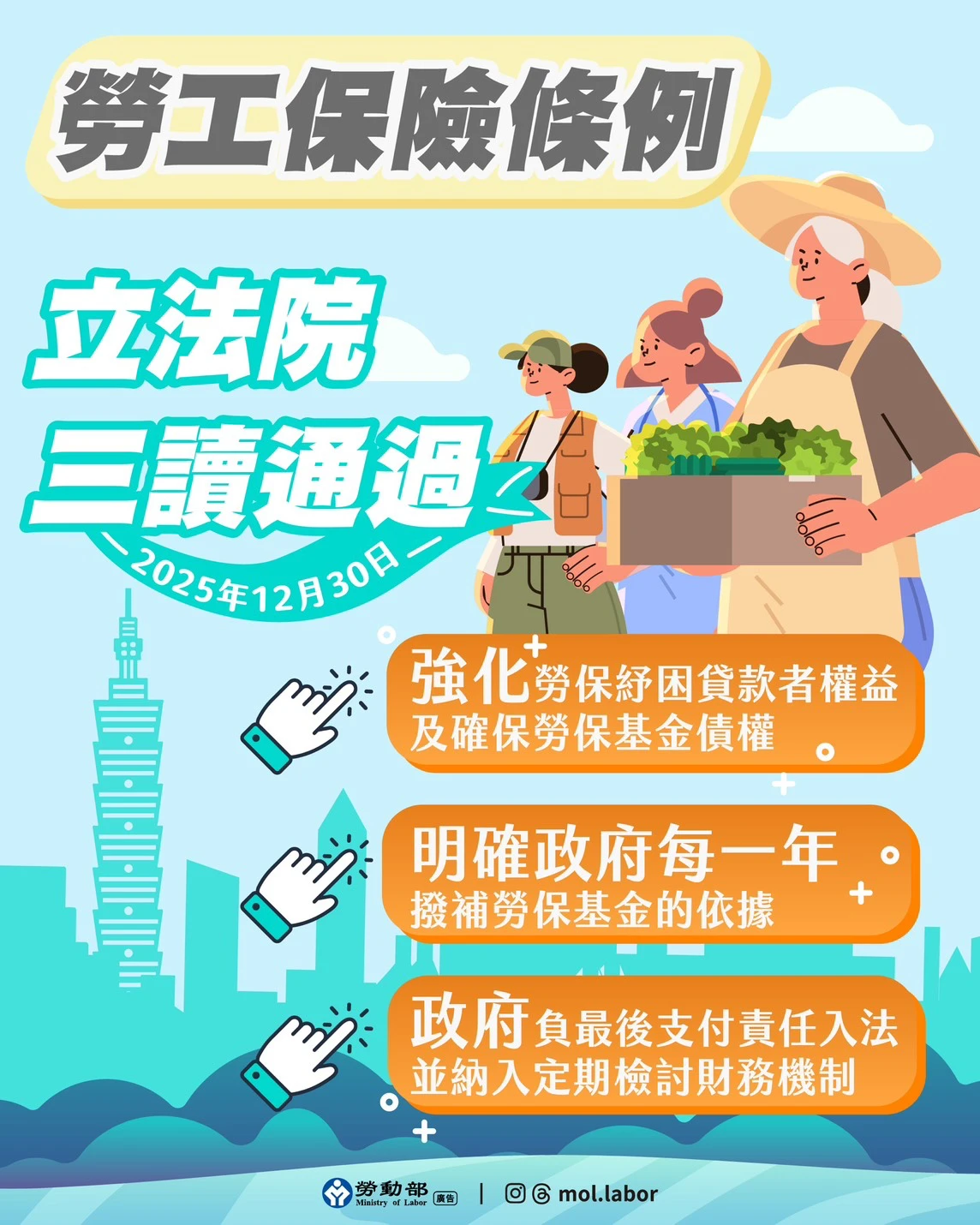 【記者賴昀岫/台北報導】立法院今(30)日三讀通過《勞工保險條例》第29條、第66條、第69條修正案。勞動部表示,本次修正重點包括強化勞保紓困貸款者權益及確保基金債權、明確政府每年撥補勞工保險基金之依據,以及政府負最後支付責任入法及納入定期檢討財務機制。