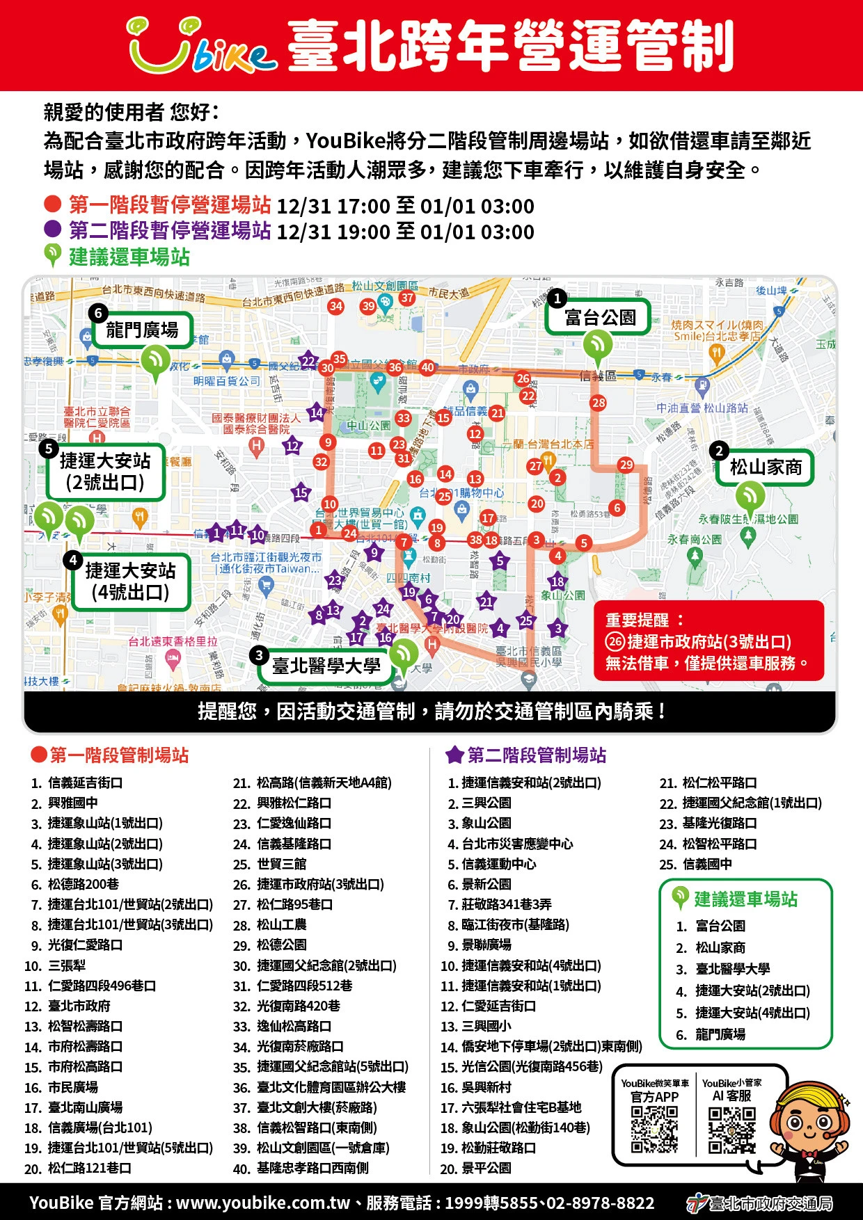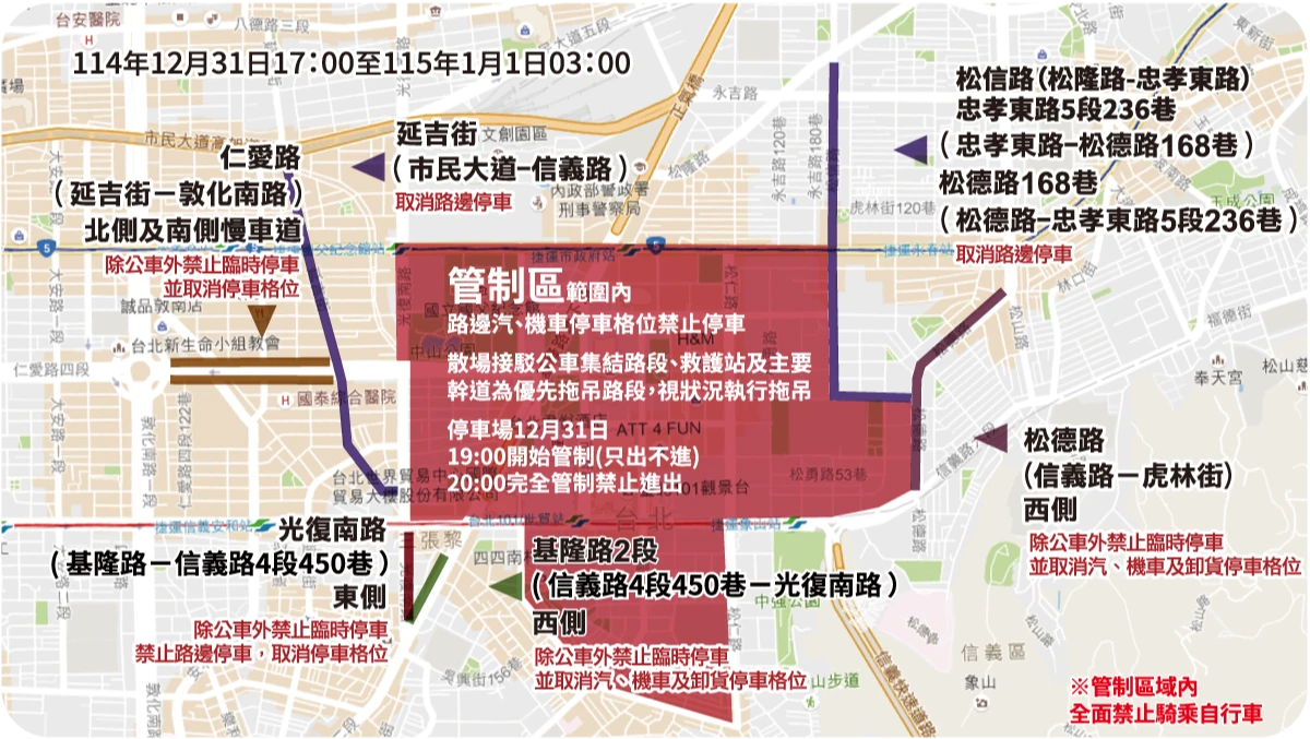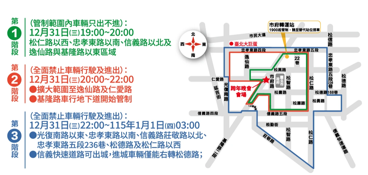 第三階段:全面禁止車輛行駛及進出。今晚10時到元旦凌晨3時,光復南路以東、忠孝東路以南、信義路莊敬路以北、忠孝東路五段236巷、松德路及松仁路以西。信義快速道路可出城,進城車輛僅能右轉松德路。