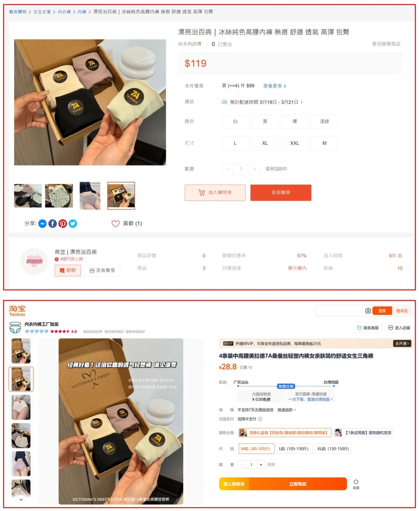 四叉貓進一步指出,劉芩妤的蝦皮賣場販售的女用內褲,一條售價119元,但同樣的商品在淘寶上一盒四條換算臺幣僅約131元,怒批劉芩妤是批發淘寶貨來台灣「翻4倍賣」,有夠暴利,小草錢真好賺。