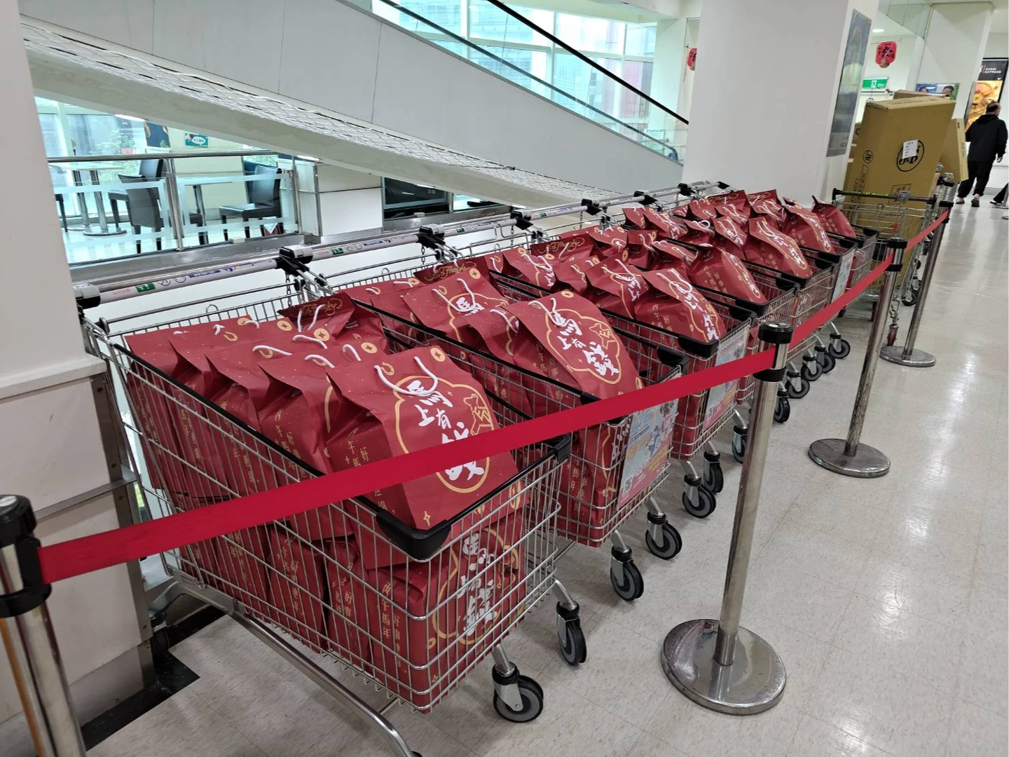 全聯表示,大安延吉門市排到第一位的民眾姜先生已連續7年搶下頭香,昨晚上11點就帶著愛犬到現場排隊,這次特地來排900元的福箱,覺得CP值非常高,還能把小狗狗放入推車中,非常實用方便。