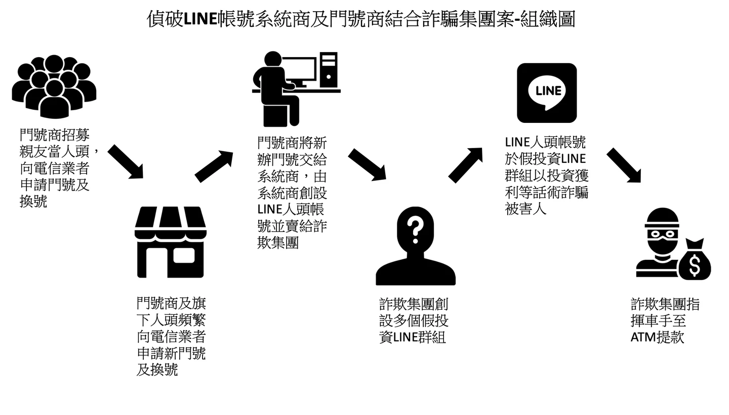 經成立專案小組深入追查,發現該詐騙集團利用電信業者的換號服務,在短時間內頻繁更換門號,大量申請帳號並註冊LINE使用,再將這些人頭帳號轉售給詐騙集團經營投資群組,詹姓主嫌甚至動員親友申辦門號,藉此規避查緝並擴大規模。