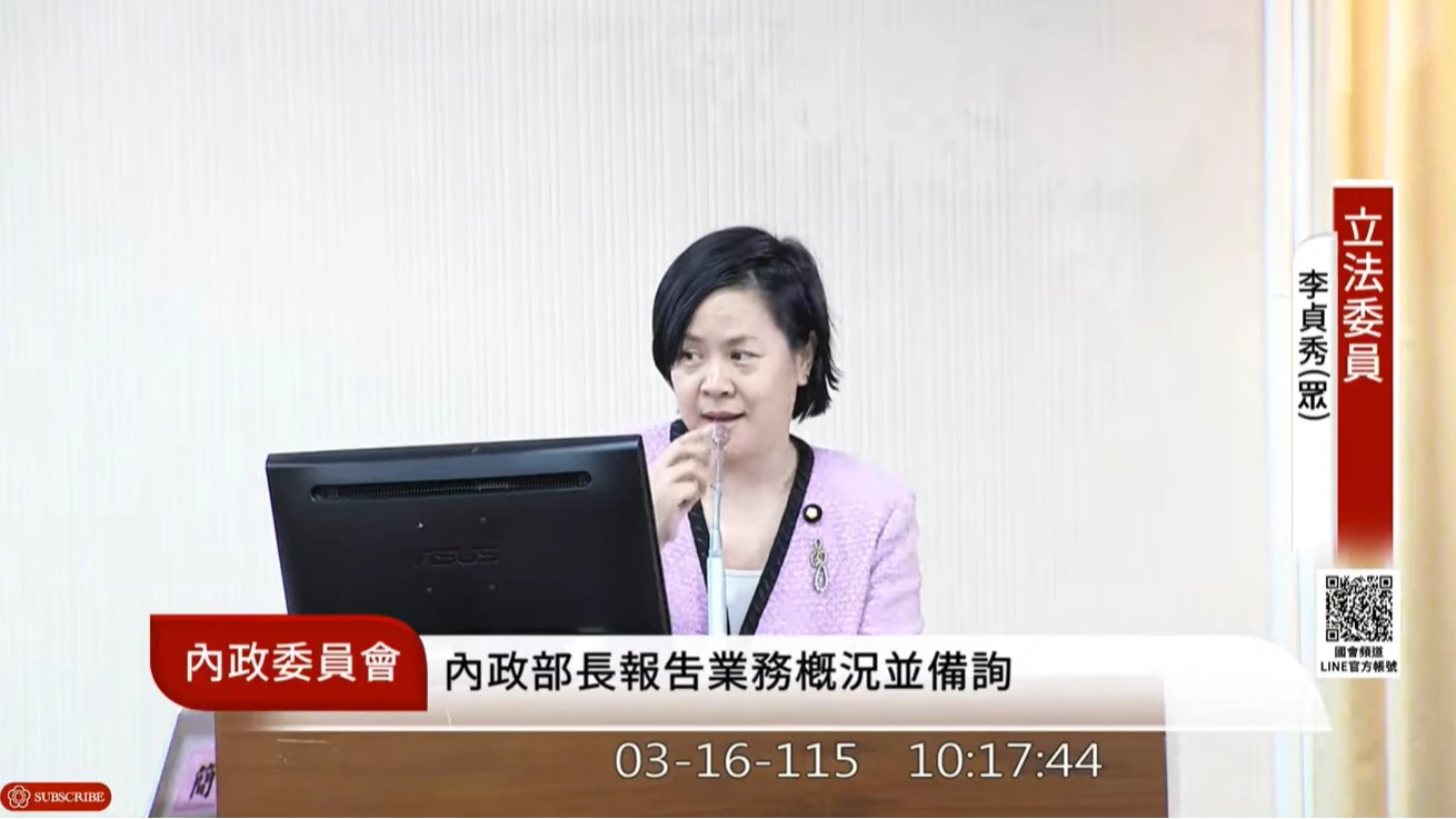 【政治中心/台北報導】立院內政委員會今(3/16) 邀內政部進行業務報告。民眾黨陸配立委李貞秀進行她就職後首場質詢,但民進黨籍召委李柏毅在會中明確裁示,因李貞秀國籍身分爭議未釐清,行政官員無須上台接受其質詢,他並當場僅稱呼李貞秀為「女士」非「委員」。