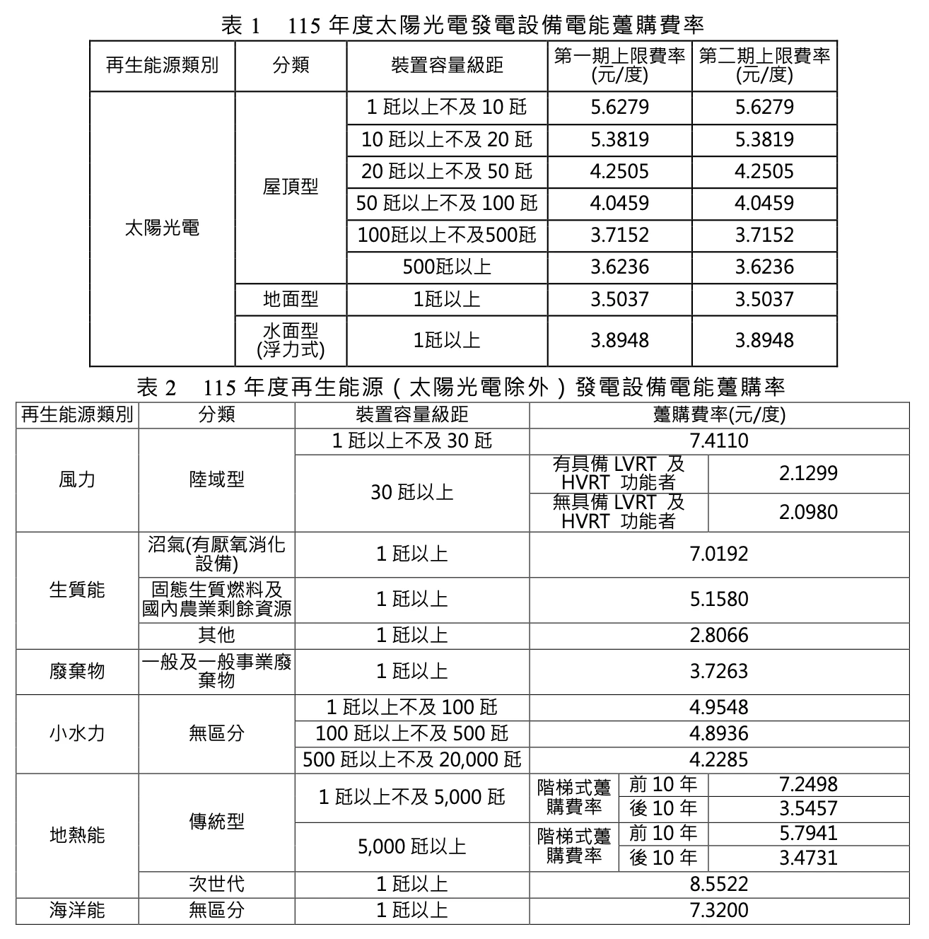經濟部說明,針對太陽光電新增汰舊換新機制;針對傳統型地熱發電設備,考量台灣商業模式仍處於發展初期,為確保業者資金調度穩定性,決議維持階梯式躉購費率機制。