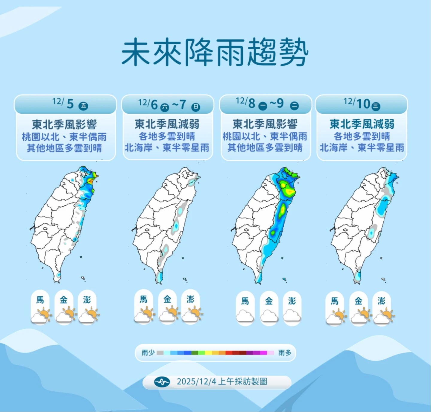 但下周一(8日)起東北季風再度增強,持續影響至9日,預計這波冷空氣較這波弱,但北台灣氣溫將再轉涼,其他地區早晚同樣偏涼。迎風面水氣增多,桃園以北、東半部及恆春半島降雨機率提高,部分地區有短暫雨,其他地區維持多雲到晴。