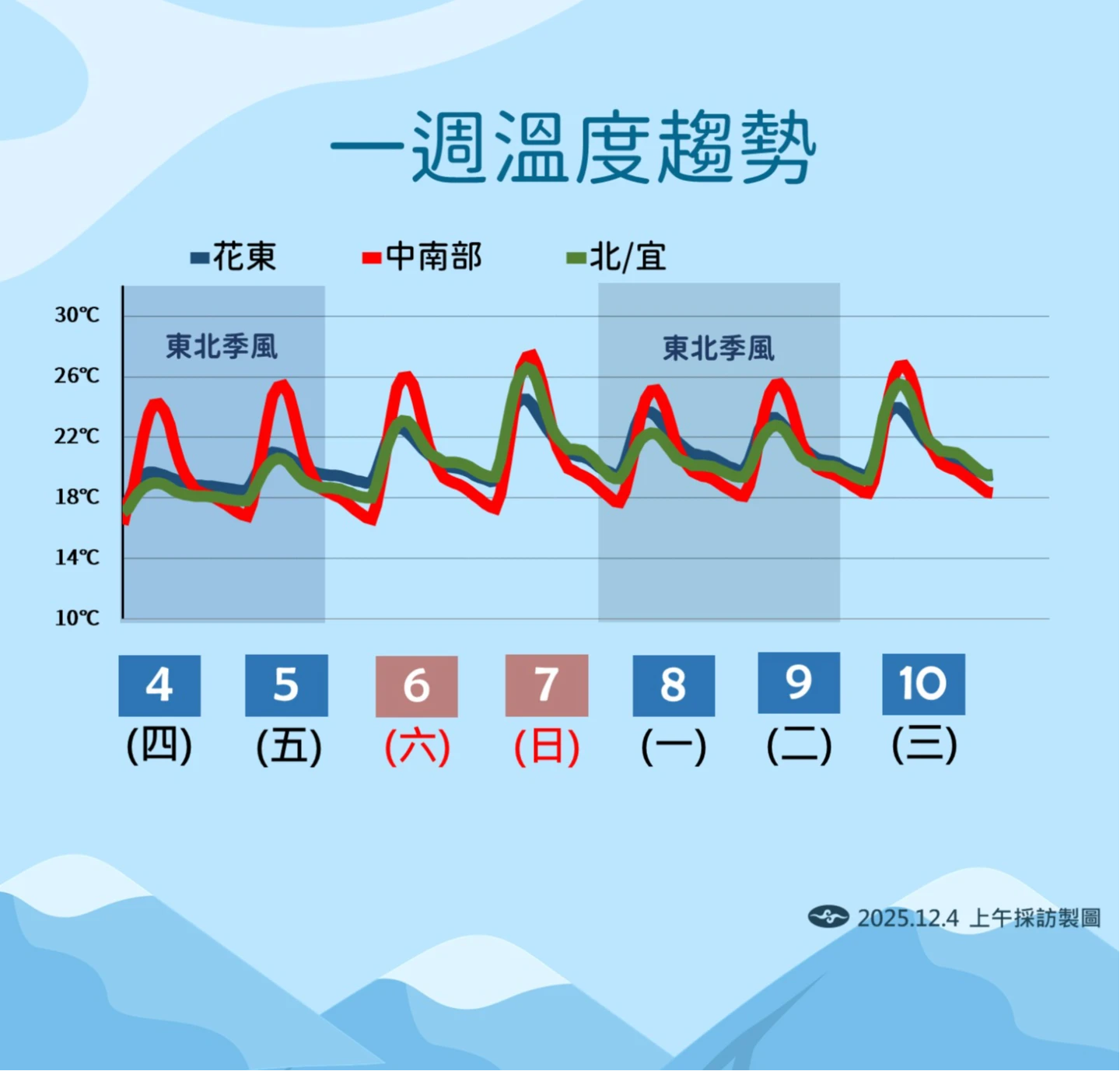 氣象署表示,這波濕冷天氣即將結束,明後天迎來周末假期,東北季風稍減弱,水氣進一步減少,全台各地氣溫將逐漸回升。周六(6日)北部、東半部及澎湖高溫約22至24°C,中南部可達26至27°C;下周日(7日)各地高溫更將回升至25至28°C,天氣相當舒適。