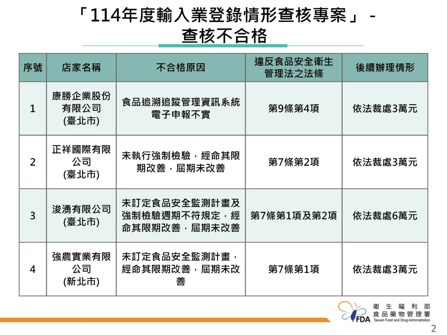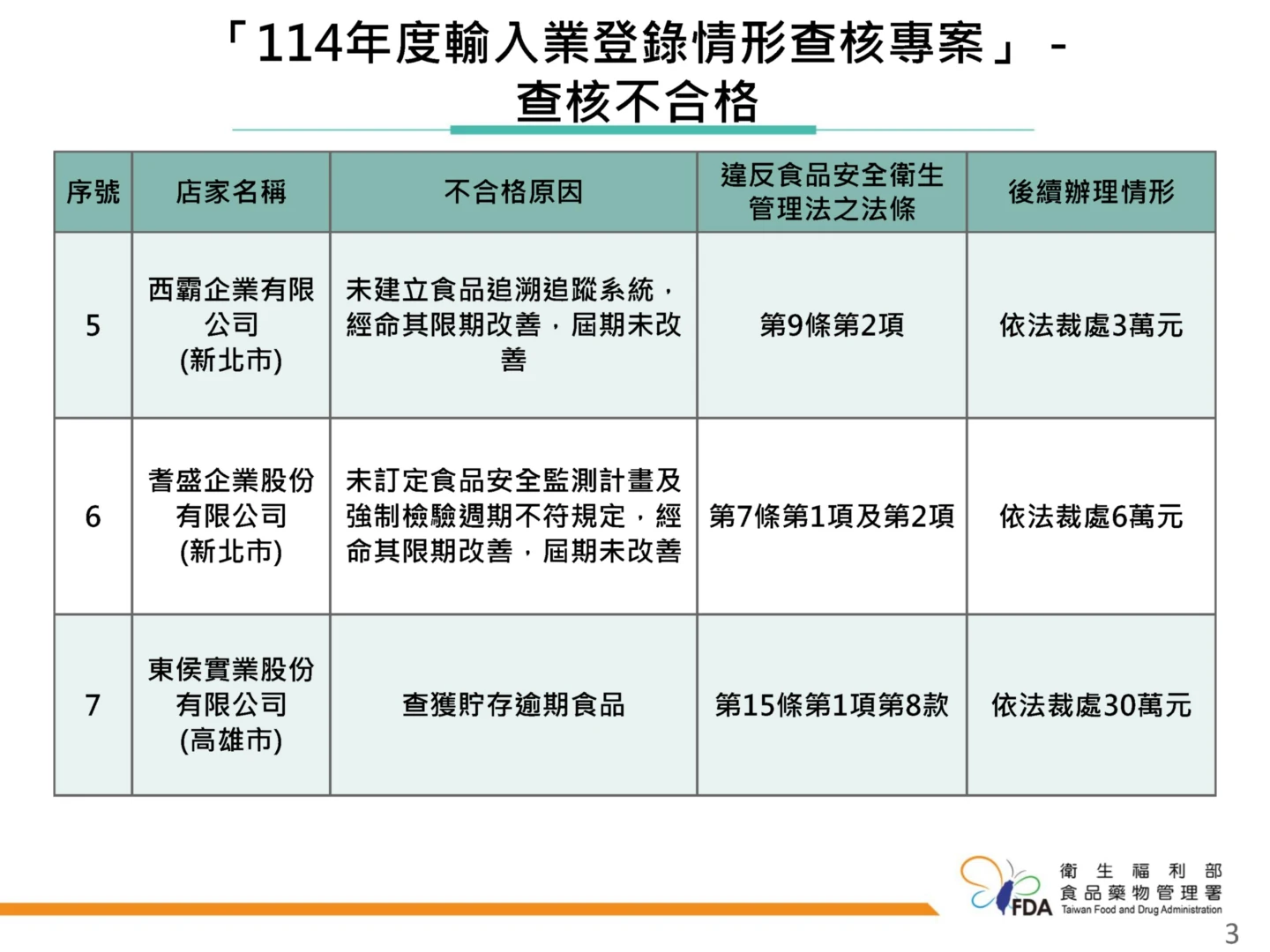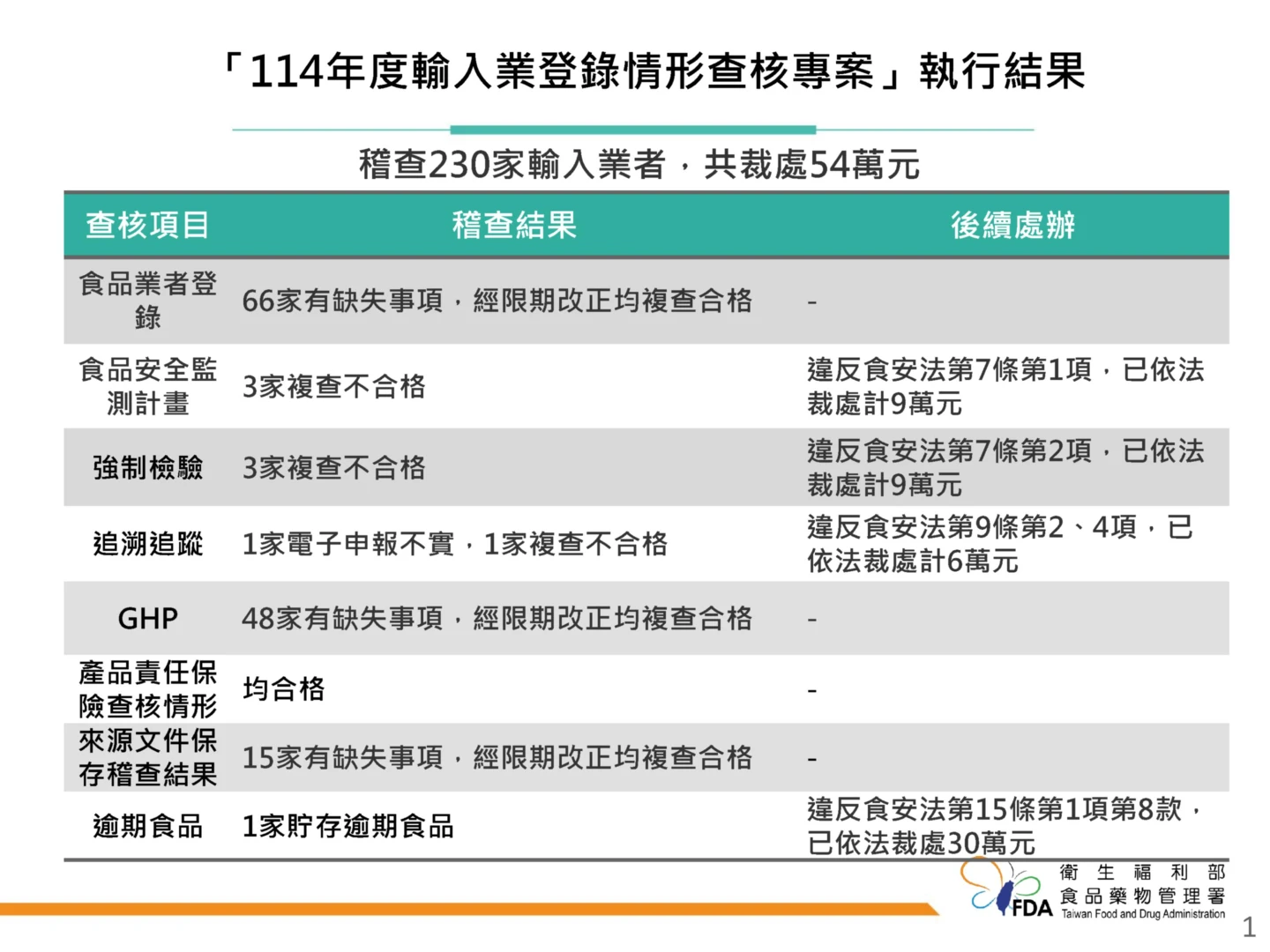 其中3家業者未訂定食品安全監測計畫、3家業者未實施強制檢驗、1家業者未建立追溯追蹤系統經限期改善,劉芳銘表示,複查仍不合格、1家業者查獲追溯追蹤電子申報不實、1家業者查獲逾期食品,上述違規業者皆已由轄管衛生局依法處辦,共計裁處新台幣54萬元。