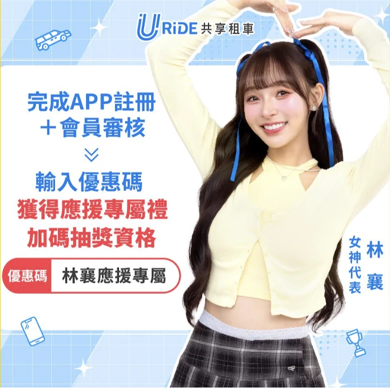 URiDE應援活動參與方式,自即日起至4月30日,完成會員註冊且通過審核後,輸入指定優惠碼「林襄應援專屬」或「峮峮應援專屬」,即可獲得URiDE提供的120分鐘免費租車券,立即體驗URiDE彈性便捷的共享出行服務。