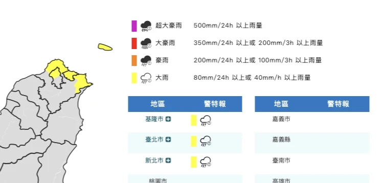 氣象署並於上午發布3縣市大雨特報,提醒民眾,受到東北季風影響,今日基隆北海岸及台北山區有局部大雨發生的機率,請民眾注意短延時強降雨及強陣風。氣象署再次強調,由於連日降雨,山區務必嚴防坍方、落石、土石流及溪水暴漲,低窪地區請慎防積水,外出務必小心路況,注意安全。