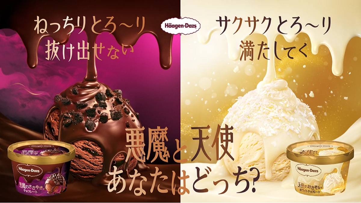 日本哈根達斯開發新商品平均需要2年時間,今年9月30日推出期間限定的迷你杯裝「惡魔低語(巧克力)」和「天使誘惑(白巧克力)」2種口味,雖然是2022年推出過的口味,但這次在商品名稱冠上「惡魔」之名,同時推出「天使」版本搶市,兩者皆強調濃厚口感,獲得消費者好評,其中惡魔銷售略勝一籌。