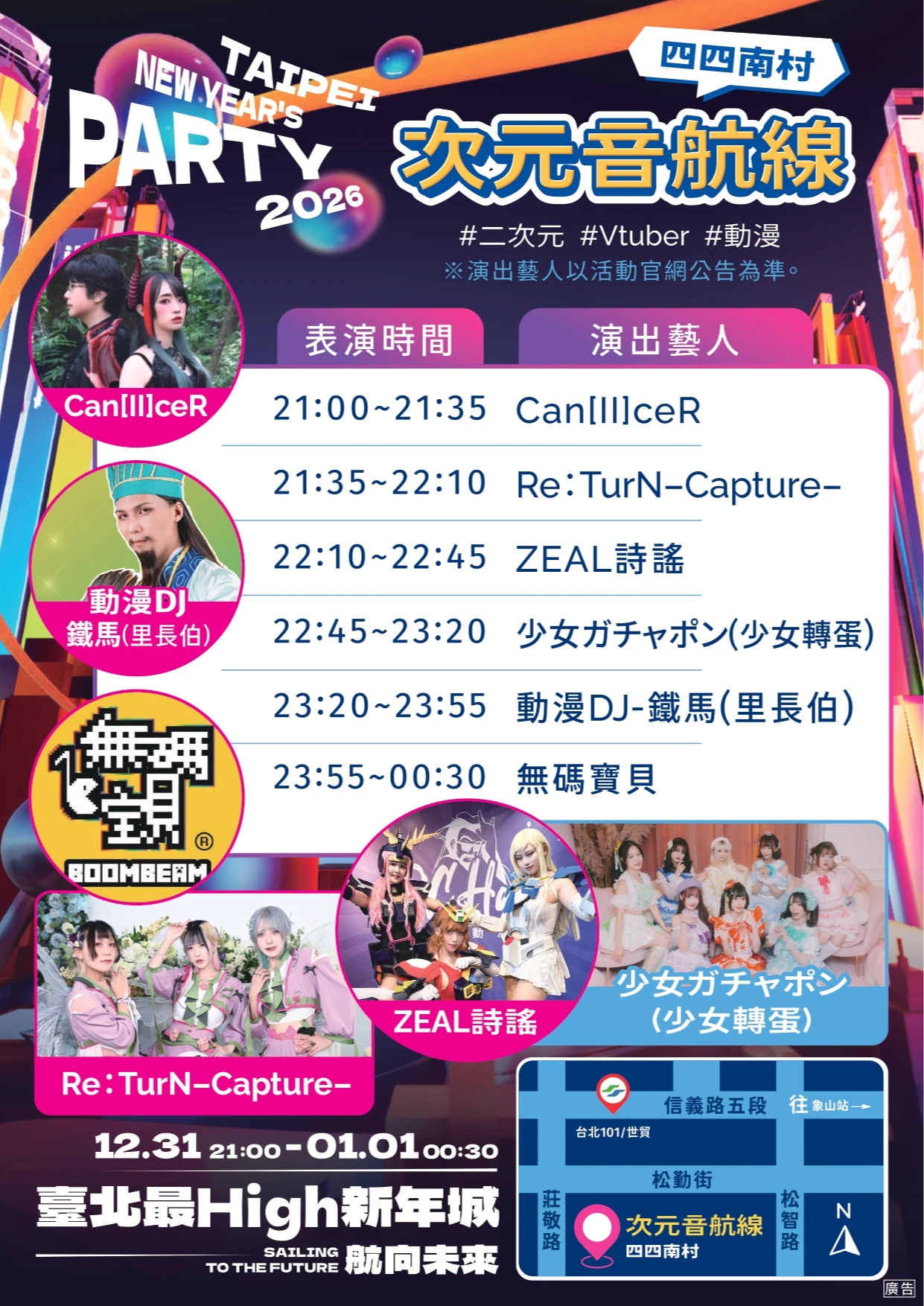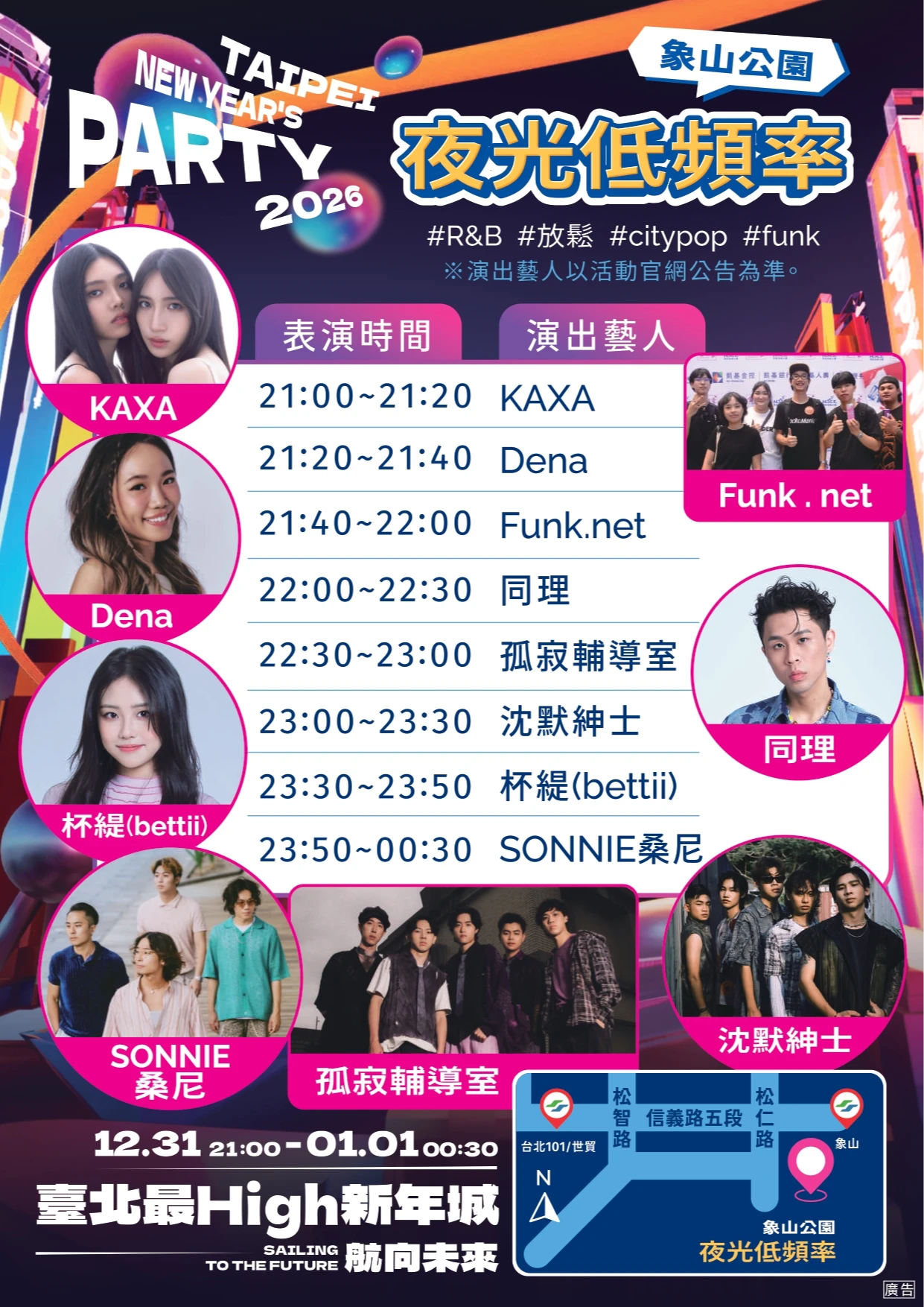 觀傳局介紹,今年跨年除了重磅卡司滿滿的主舞台,當日還有4大多元舞台,將在「東區頂好廣場」、「景勤一號公園」、「象山公園」及「四四南村」舉辦,以電音與輕搖滾、民歌、R&B、動漫DJ秀等各種不同風格打造台北跨夜音浪。