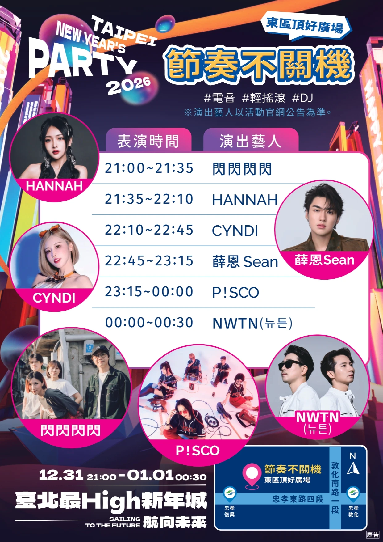 位於東區頂好廣場「節奏不關機」,舞台主題以電音與輕搖滾為主軸,邀請到閃閃閃閃、HANNAH、CYNDI、薛恩 Sean、P!SCO、NWTN(뉴튼)等人氣卡司輪番開唱;今年首度新增四四南村以「次元音航線」為主題,演出包含 Can[II]ceR、Re:TurN-Capture-、ZEAL詩謠、少女ガチャポン(少女轉蛋)等,以動漫DJ秀、歌舞與經典神曲呈現二次元魅力。