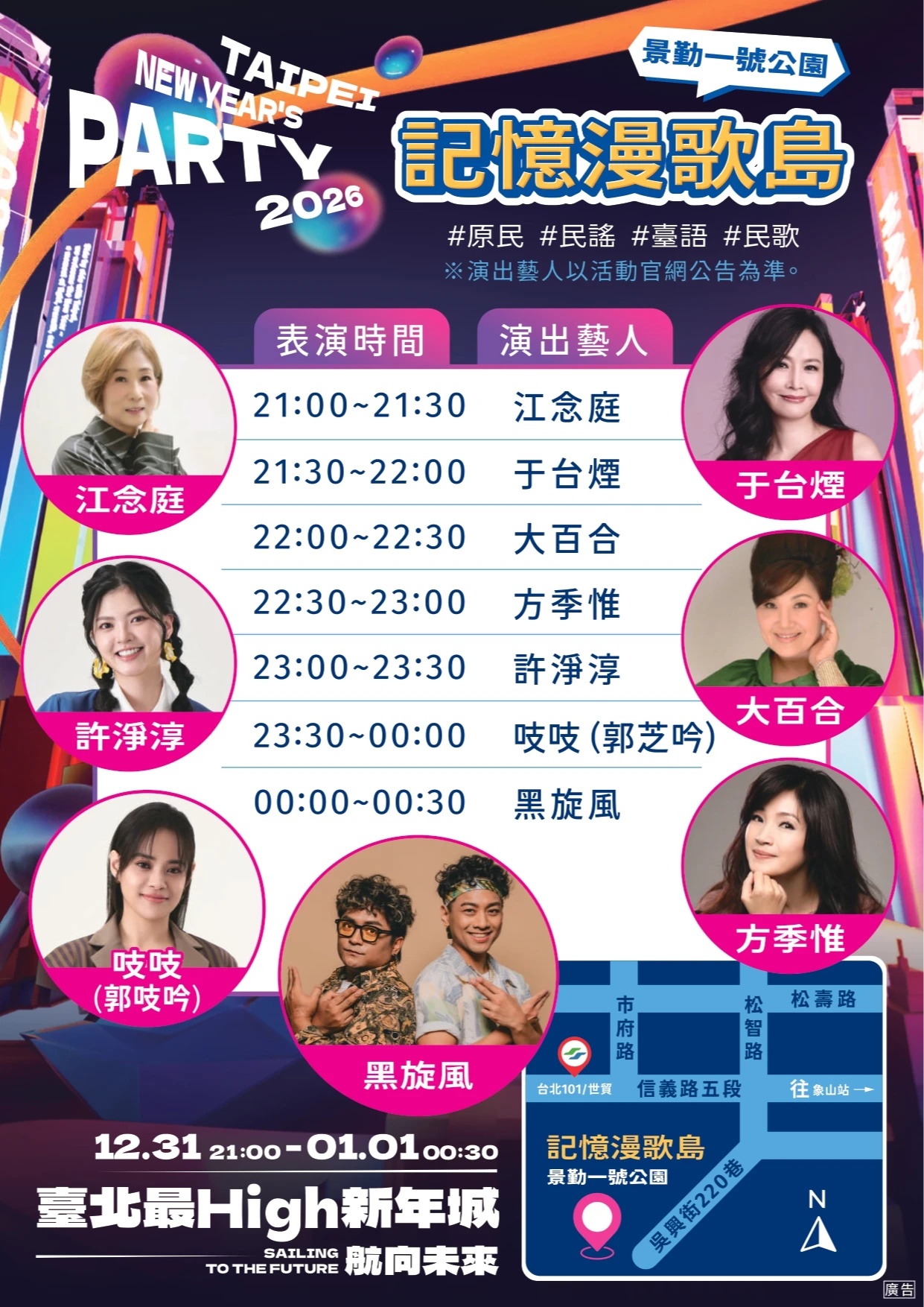 另外,位於象山公園「夜光低頻率」,由聖恩主持,卡司包括KAXA、Dena、Funk.net、同理、孤寂輔導室、SONNIE桑尼等為跨年夜帶來質感流線;在景勤一號公園的「記憶漫歌島」多元舞台則融合民歌、民謠,演出包括江念庭、于台煙、大百合、方季惟、許淨淳等演繹經典旋律。