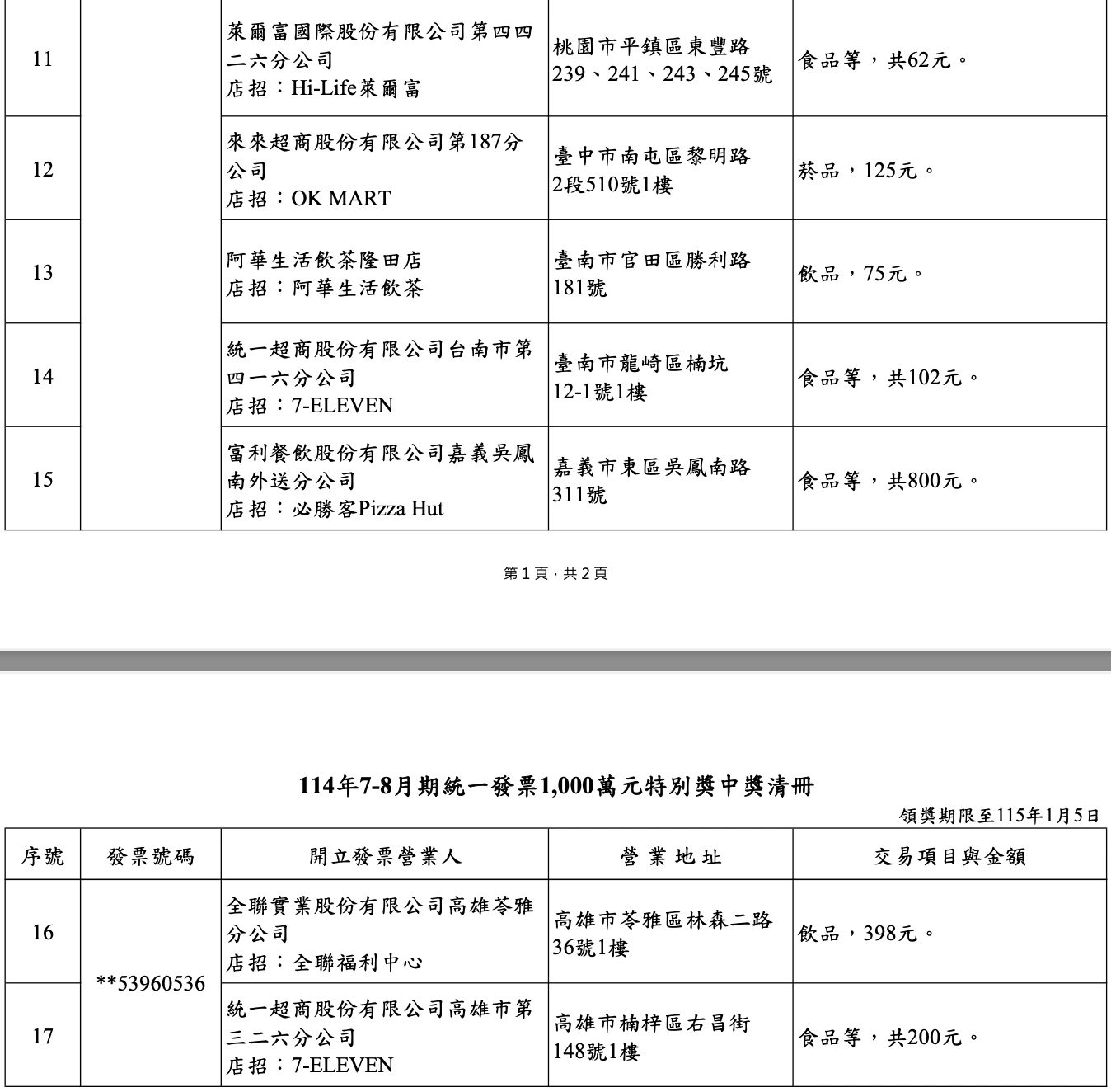 全聯福利中心開出2張特別獎,1張開在新北五股德音門市,中獎者消費699元購買香菇、雞蛋、豬肉等食材;另1張在高雄苓雅門市,消費398元購買咖啡。
