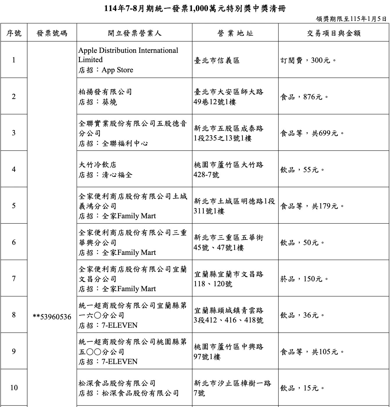 超商、超市已公布的千萬中獎人已有10位。除了已公布超商與超市10張千萬發票之外,其他7張千萬中獎為汐止松深食品買巧克力調味乳15元、桃園清心福全55元、台南阿華生活飲茶75元、OK Mart買菸125元、Apple訂閱費300元、嘉義Pizza Hut 800元、大安蔡燒買食品876元。