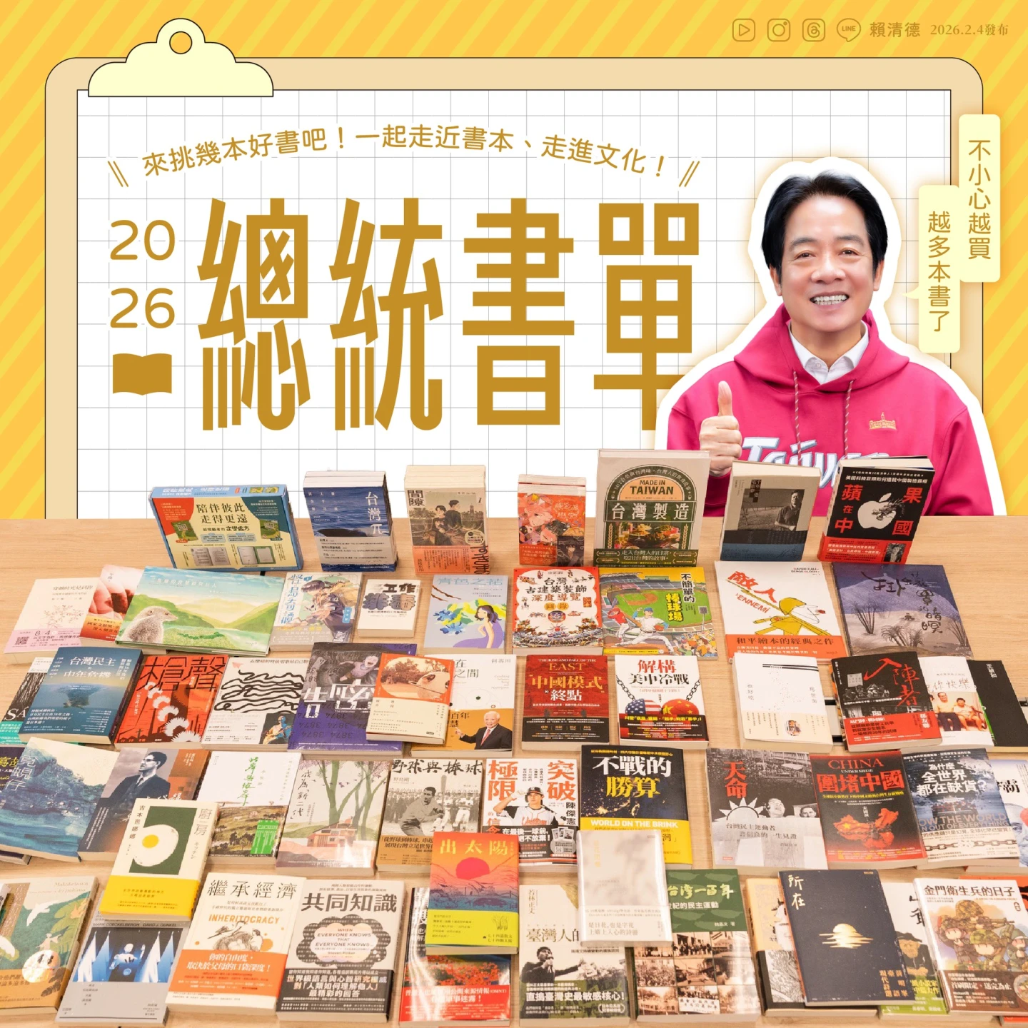 「我的2026 推薦書單!」賴清德今天在臉書發文表示,自己在書展現場看到從漫畫到詩集等各類書籍,忍不住一本接著一本購買,向民眾溫情喊話:「2026年,邀請大家一起挑幾本好書,讓閱讀成為生活的一部分,走近書本,也走進文化。」他呼籲國人用行動支持好書,共同支持台灣豐富的出版產業與優秀創作者。