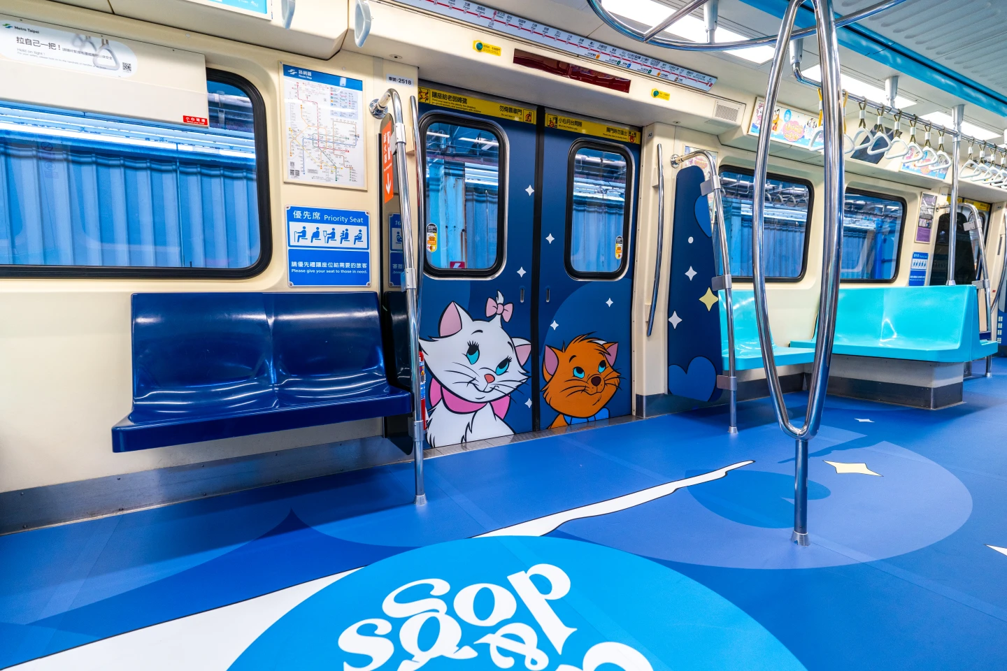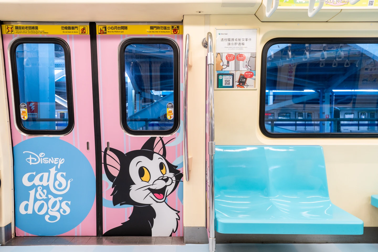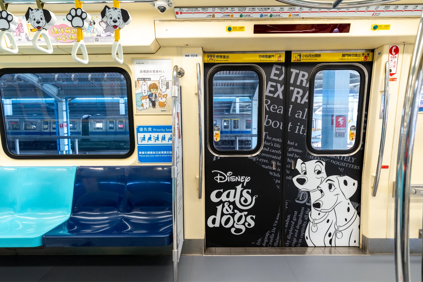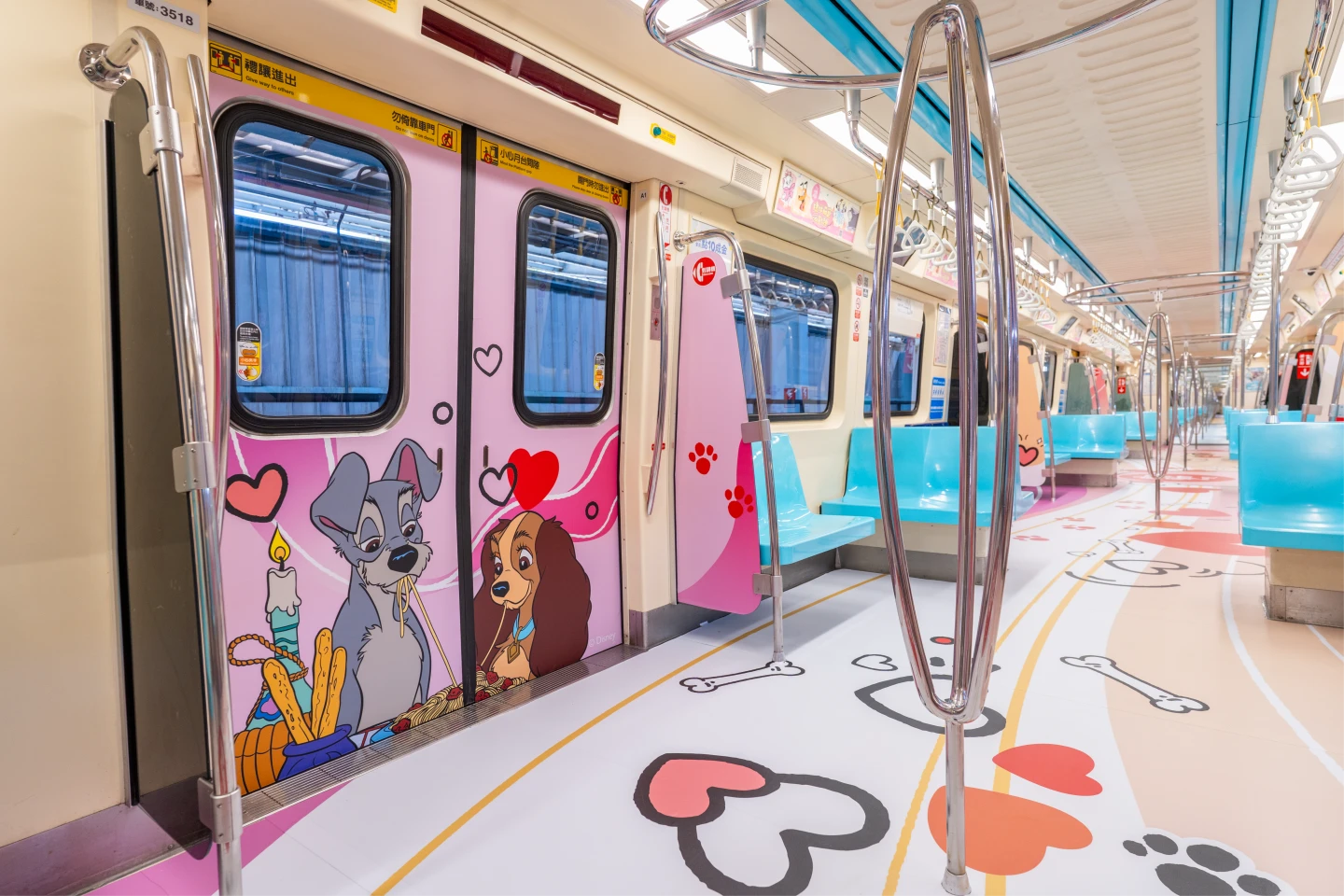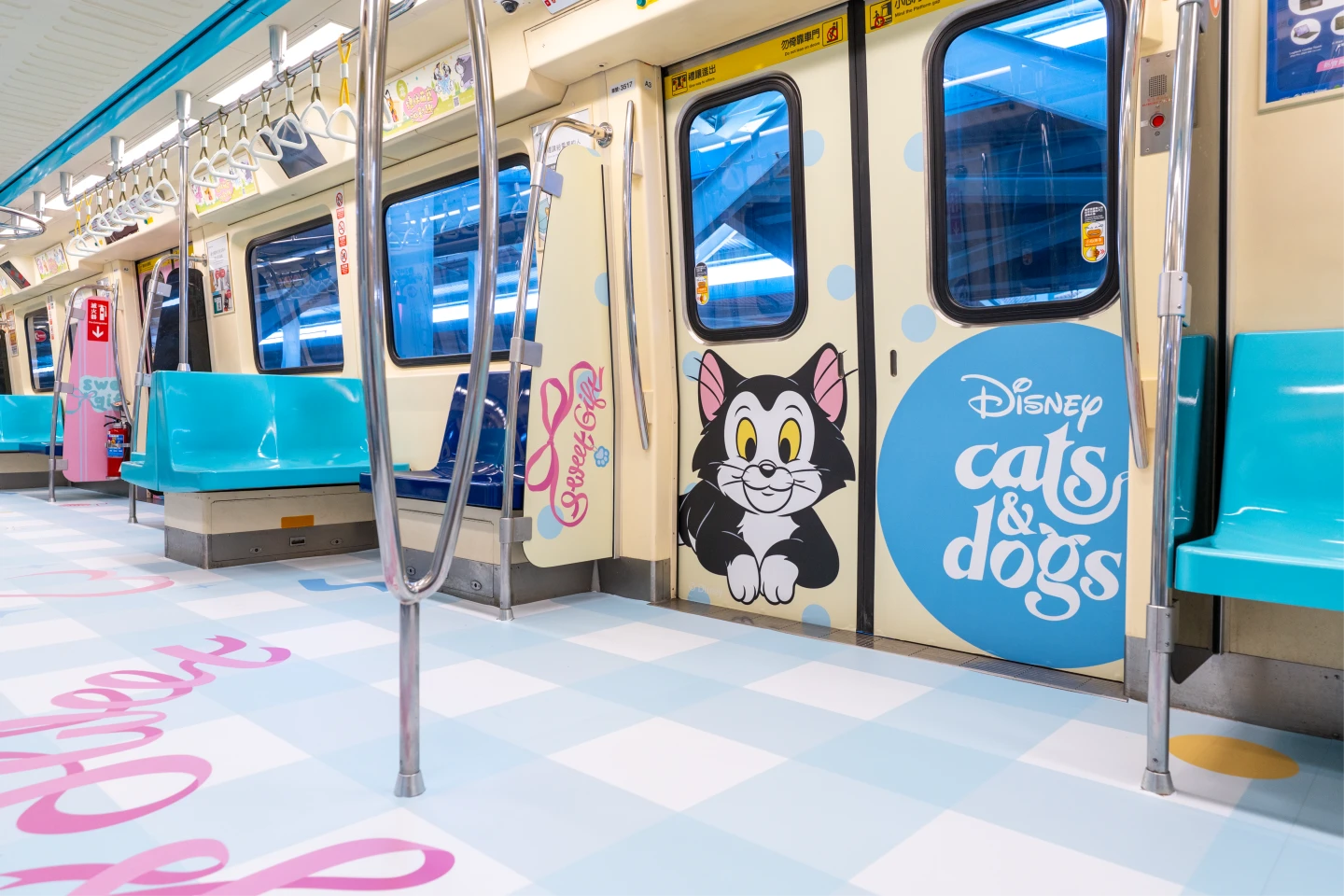 不只如此,台北捷運公司也結合迪士尼打造全新主題彩繪列車,6節車廂每節皆以不同的超人氣貓狗主題設計,從傲嬌又可愛的魯斯佛、活力滿滿的布魯托、圓滾滾大眼的費加洛、浪漫甜蜜的小姐與流氓、氣質優雅的瑪莉貓,到踩著黑色小腳印的101忠狗,每一節車廂都充滿驚喜與拍照亮點。