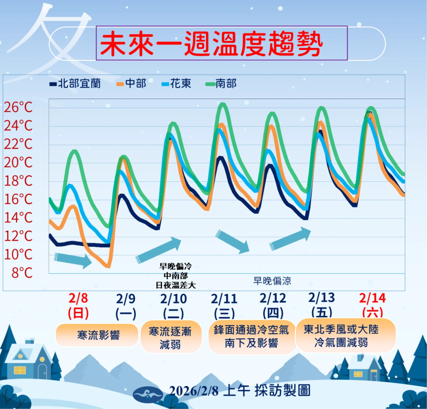 值得期待的是,周末(14日)情人節當天,預測將是穩定晴朗的好天氣,直到周日(15日)才會有下一波弱冷空氣影響。在回暖之前,請家中有長輩與心血管疾病患者的民眾,務必密切關注氣溫變化與身體狀況。