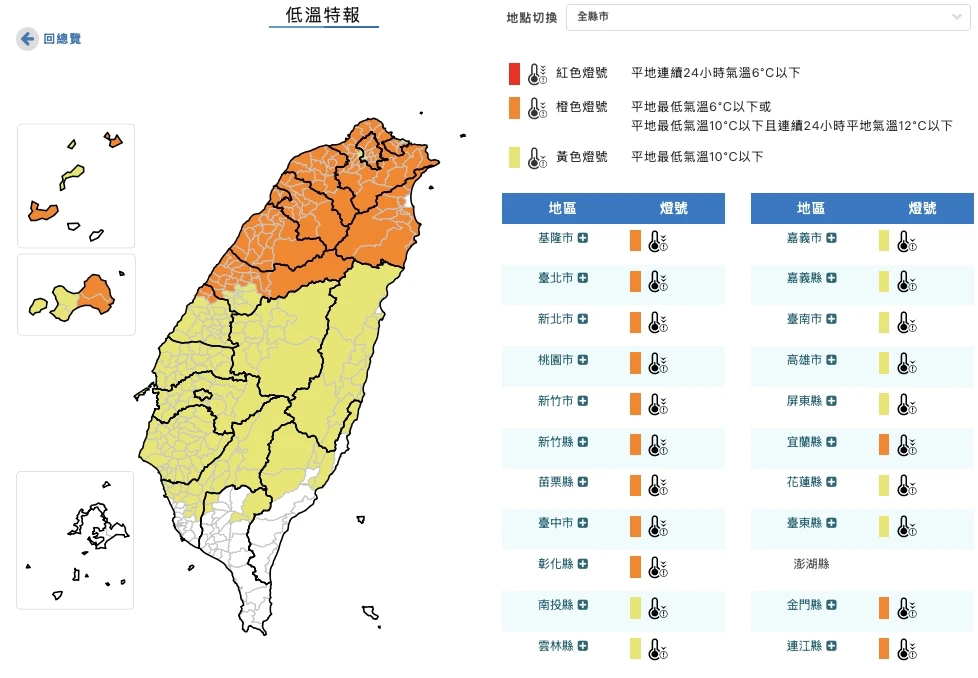 中央社報導,氣象署發布低溫燈號資訊顯示,極度寒冷的「橙色燈號」區域範圍廣大。其中,新竹縣、苗栗縣、宜蘭縣及金門縣有出現攝氏6度以下氣溫的機率,需特別防範低溫災害。此外,新北市、基隆市、台北市、桃園市、新竹市、台中市及彰化縣等地,亦有持續10度左右或更低溫的可能;連江縣則需防範持續6度左右的低溫。至於黃色燈號(10度以下)範圍則涵蓋南投、雲嘉南、高屏及花東地區。