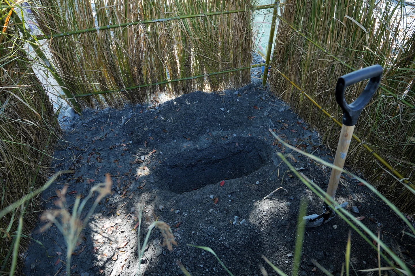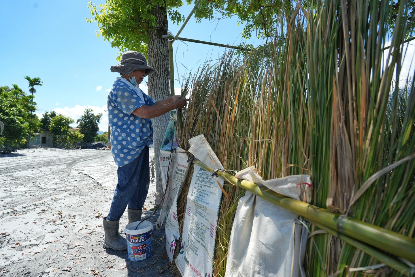 記者遠遠看見一顆檳榔樹旁,有男有女正在用芒草與竹子搭建某個方形建物,湊近一看,發現是間簡易茅房,四面牆都是用天然植物所蓋,就連固定方式都是將竹子切成薄絲纏繞而成,如此巧思讓人驚艷;由於芒草仍有空隙,最後加工將肥料袋固定在牆面下方,增加隱密性。