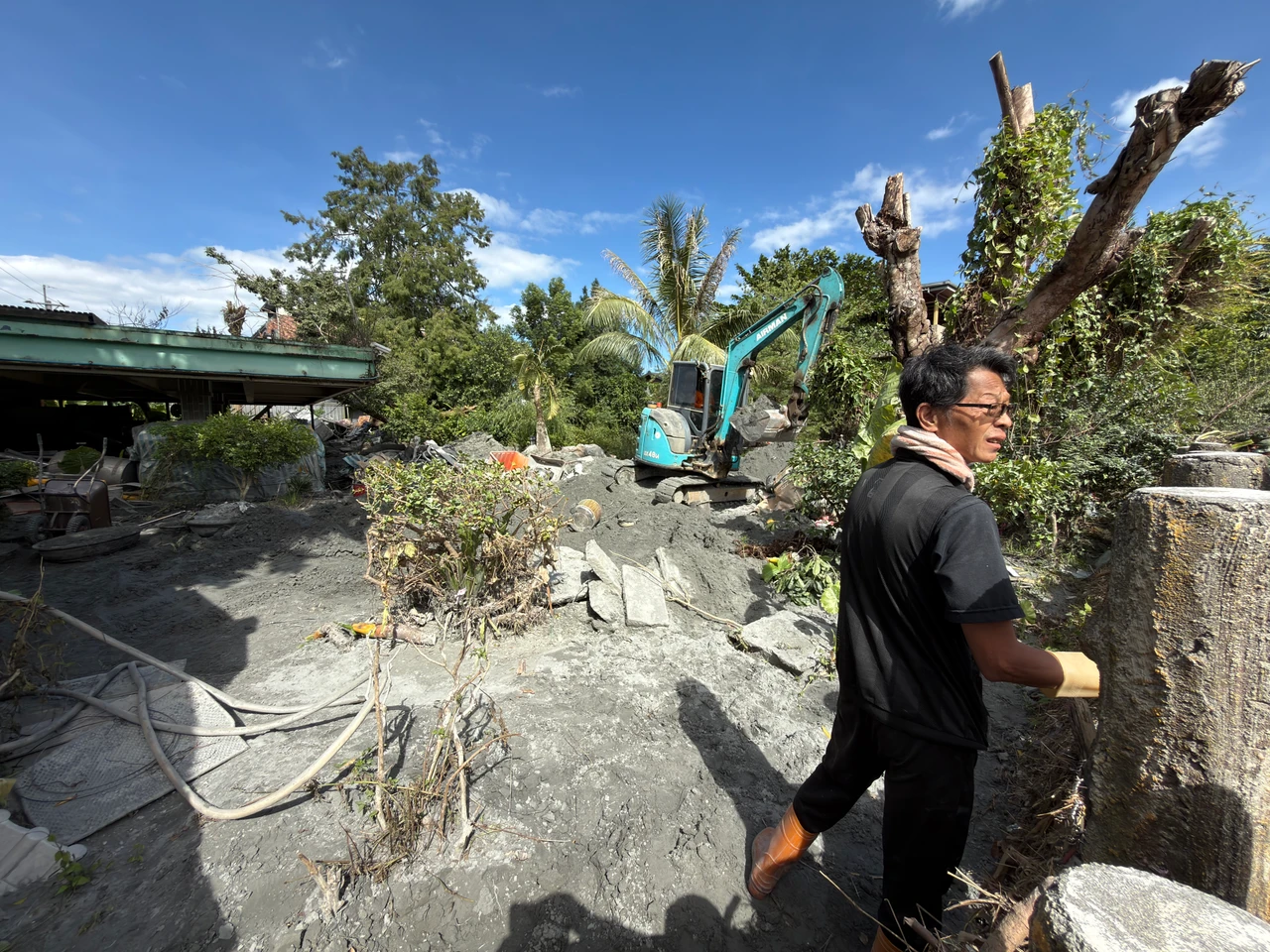 上大和民宿曾姓老闆的庭園堆積半身高的淤泥,也在國軍弟兄指揮重機志工進入後,開始效率開挖,他也露出欣慰神色,重建家園的活,正一點一點向前推進,而這一切還好有國軍和志工幫忙,讓他們不孤單。