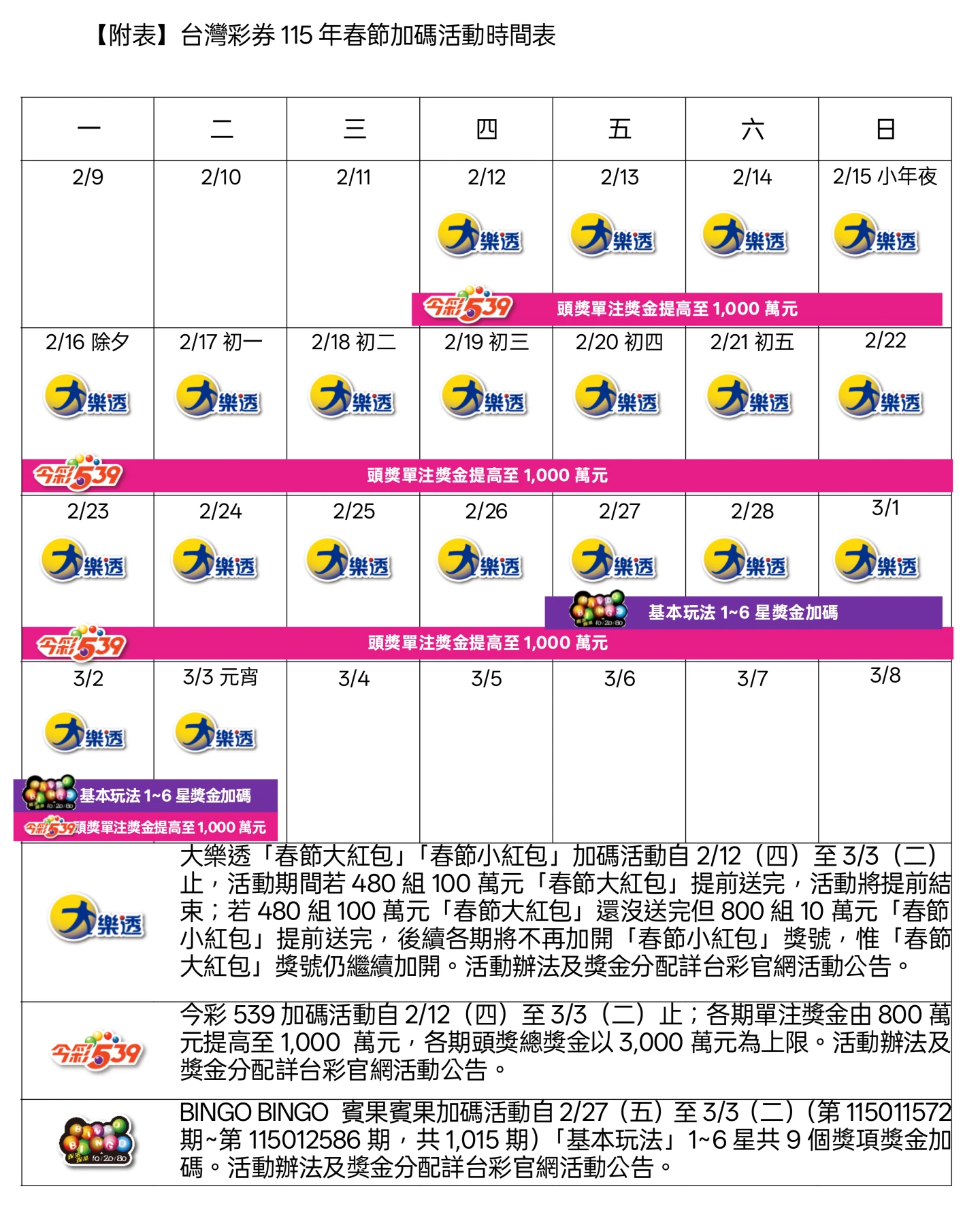 | 大樂透 | 春節大紅包 | 480組,每組100萬元 | 2月12日至3月3日 | 加開9個獎號 |
