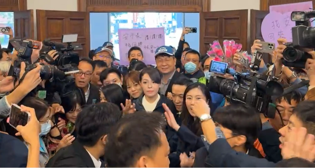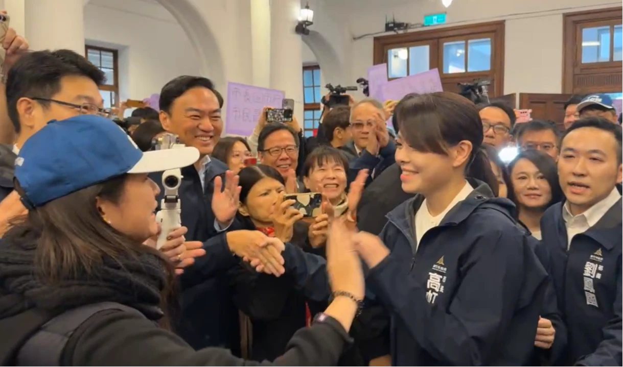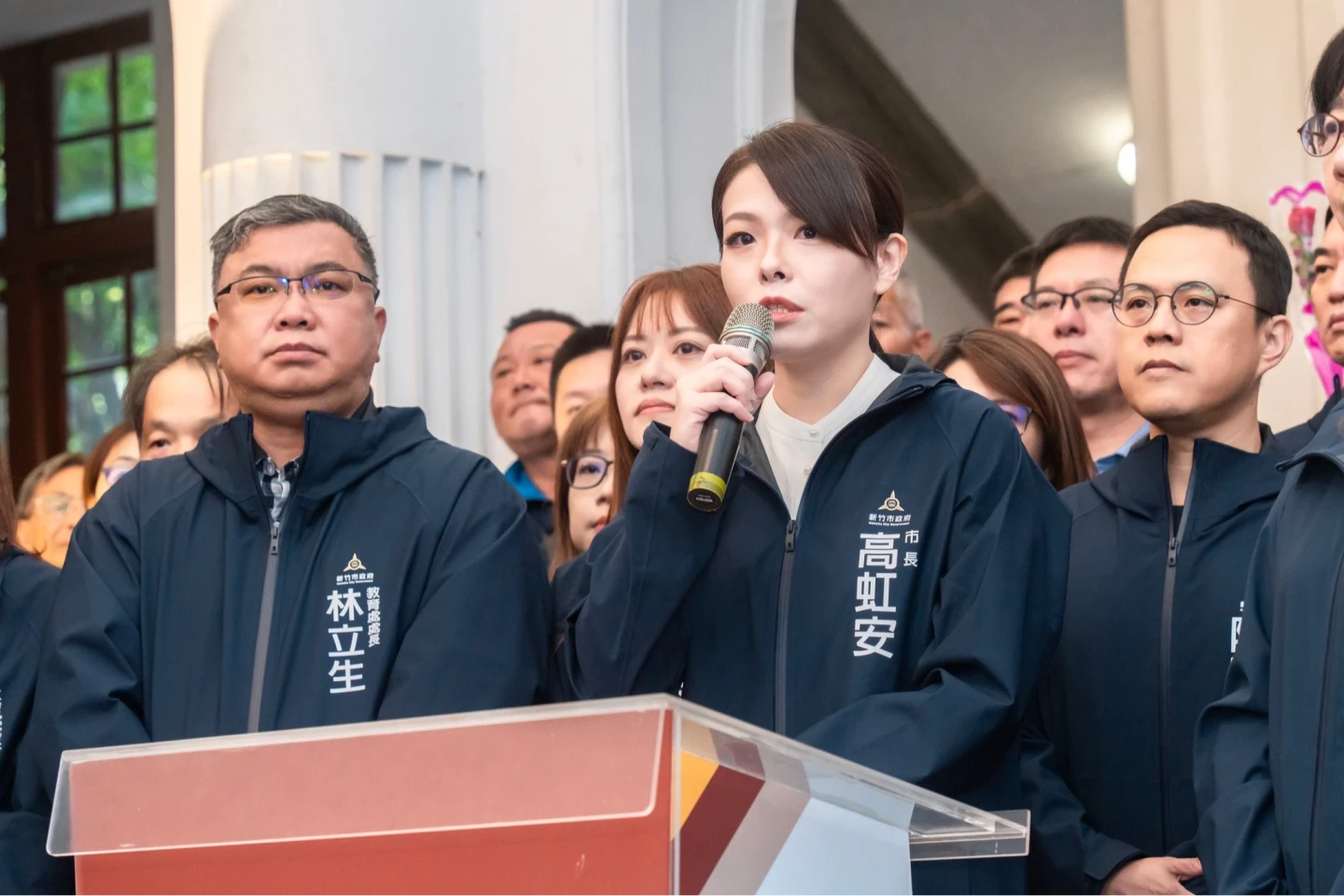 新竹市長高虹安今天復職,新竹市政府外湧入大批記者和支持民眾,見到高虹安走進,紛紛送上花束和擁抱,令高虹安感動不已,她並向大家比出「愛心手勢」表達心意,並感動地說「在我逆風的時候,在我人生低谷的時候,給予我的溫暖和支持,其實比在順風的時候給予的掌聲,是更加令人感動與刻骨銘心!」