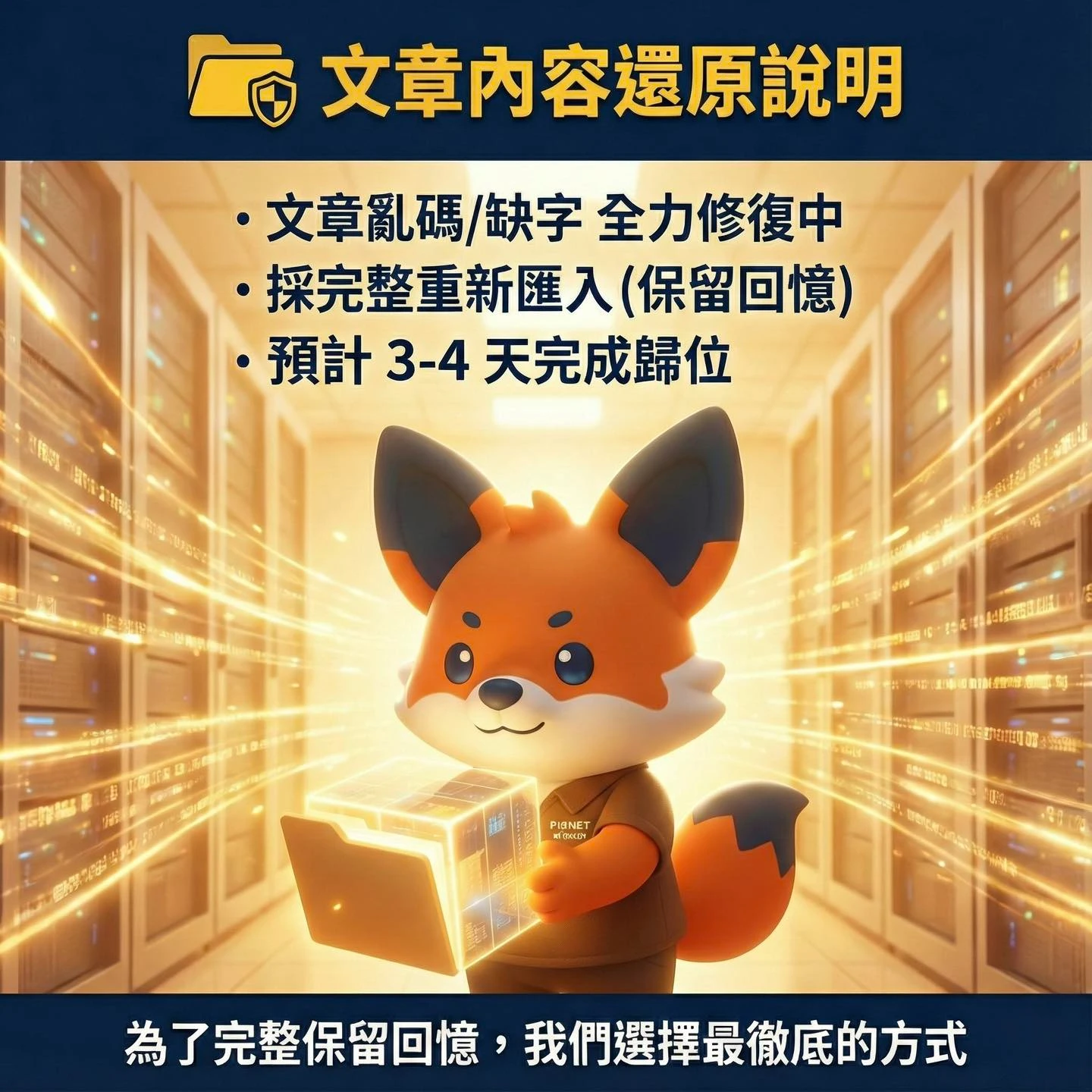痞客邦表示,之所以這幾天部分文章看起來還是有問題,是因為新舊資料庫編碼轉換異常後,為了最完整保留大家的回憶,不願做局部覆蓋,而是選擇了最徹底但最耗時的方式——「將舊資料重新編碼,從頭匯入」。這項復原工程目前仍在持續運作中,但因為累積的資料量真的非常龐大,為了確保不再出錯,系統比對跑得比預期久一點。「目前的修復進度已經在最後階段,預計還需要 3-4 天 左右才能讓所有文章完全歸位。這段過渡期造成閱讀不便,真的很不好意思,再給我們一點時間,它們馬上就回來了!」