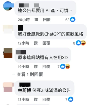 不過該道歉信卻不受好評,一堆人看用字和排版狂酸「連公告都要用 AI 產,可憐」、「我好像感覺到ChatGPT的道歉風格」、「笑死AI味滿滿的公告」、「Chatgpt 寫的嗎」、「AI文體也太明顯。」
