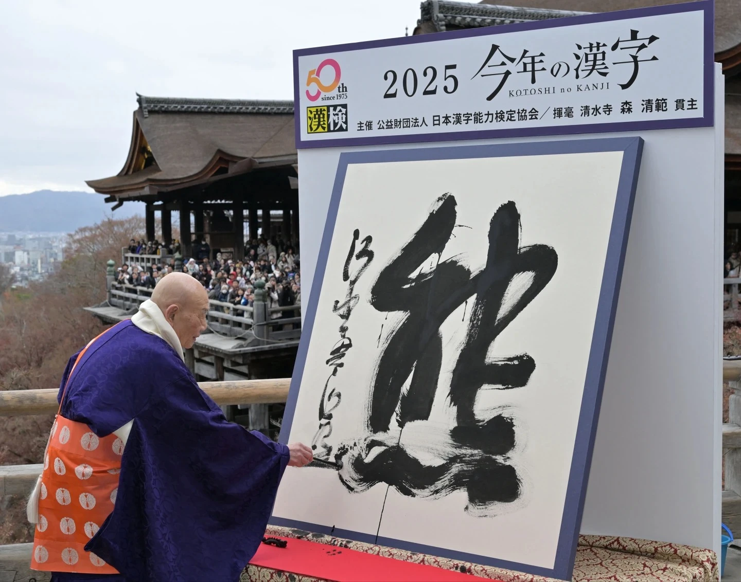 根據日本共同社報導,日本年度漢字12月12日依慣例在京都市清水寺發表,住持森清範在特大的和紙揮毫,寫下「熊」字。
