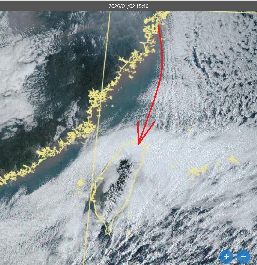 民間氣象粉專「台灣颱風論壇|天氣特急」指出,強烈冷空氣正傾洩而下,冷空氣通過相對溫暖的洋面後,所形成一層層排列的雲街(冷平流雲系),象徵冷空氣推進的進度及走向,「光看就好冷。」