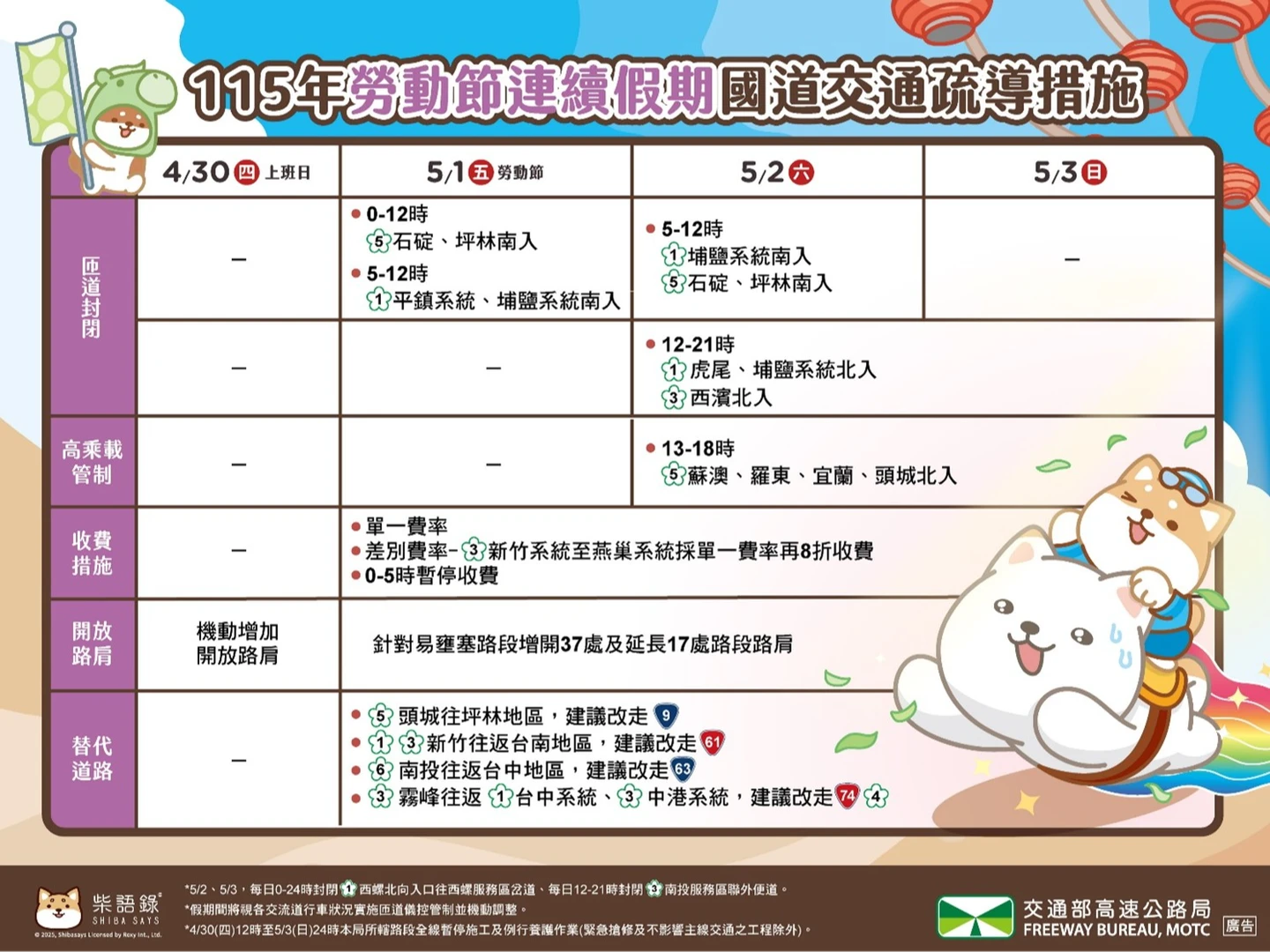 5月3日,國1北向16-20時西螺-埔鹽系統、16-20時南屯-后里、15-21時苗栗-湖口;北向15-20時竹山-中興、15-20時草屯-霧峰、14-20時大山-香山、15-21時關西-大溪。國5北向10-21時宜蘭-坪林。國4西向13-16時潭子系統-豐勢。國6西向13-19時東草屯-霧峰系統。國10西向15-20時仁武-左營端。