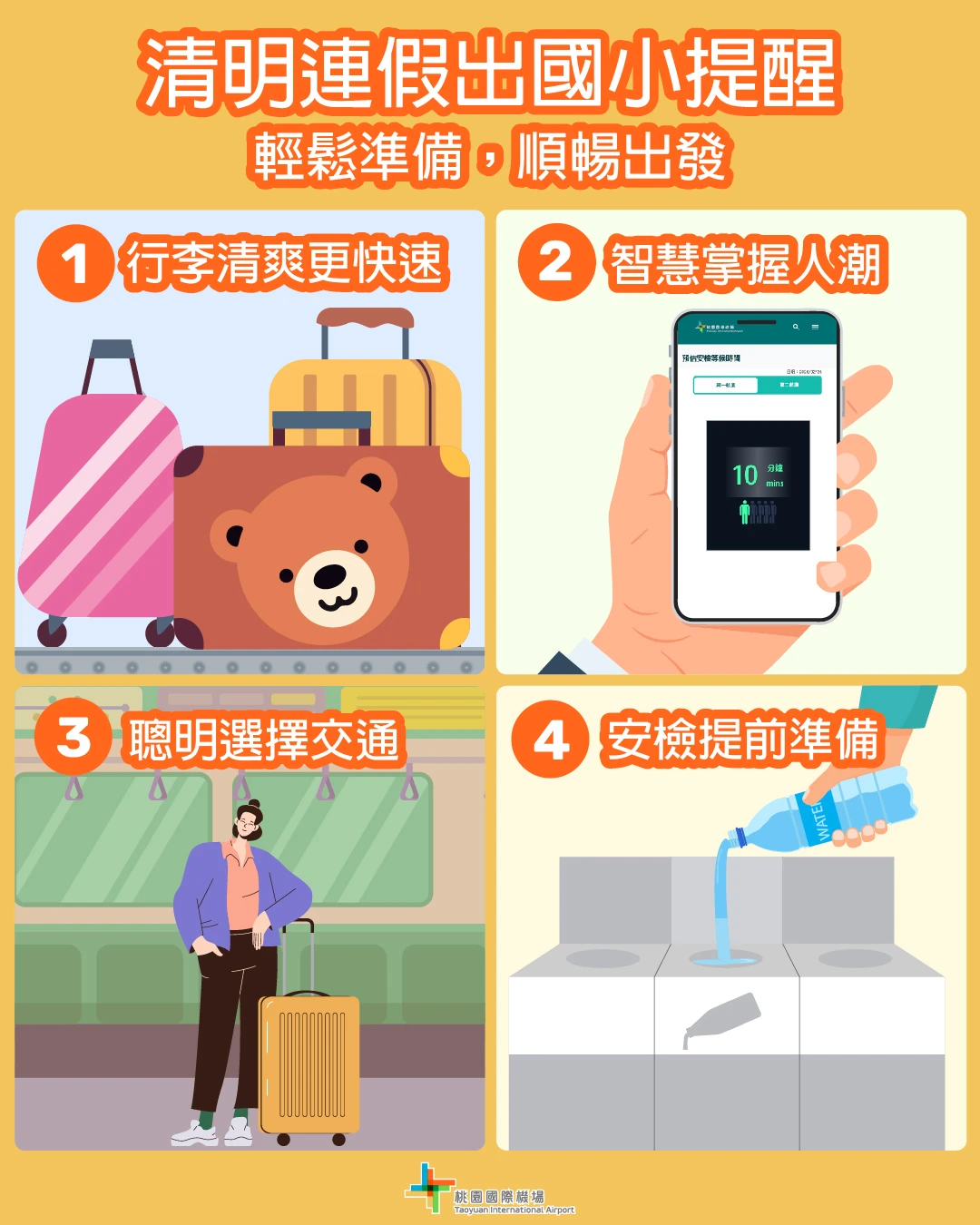 桃園機場提醒,連假出國時可注意3大點,像是行李建議「不使用」行李保護套或綁帶,並提前移除舊的託運標籤,讓行李更順利通關。 善用「AI 出發安檢人流統計」,提前查看安檢等候時間。多利用機場捷運與客運,避開連假車潮更省時。
