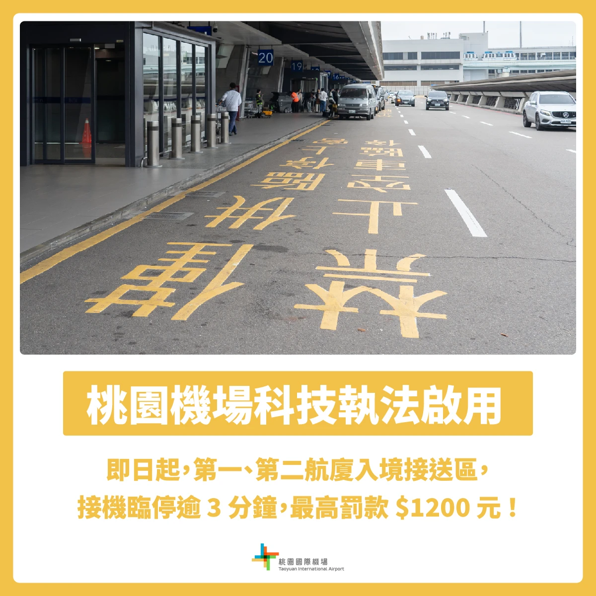 桃園國際機場指出,機場科技執法已啟動,即日起,第一和第二航廈入境接送區,只要接機臨停逾3分鐘,最高罰款1200元。
