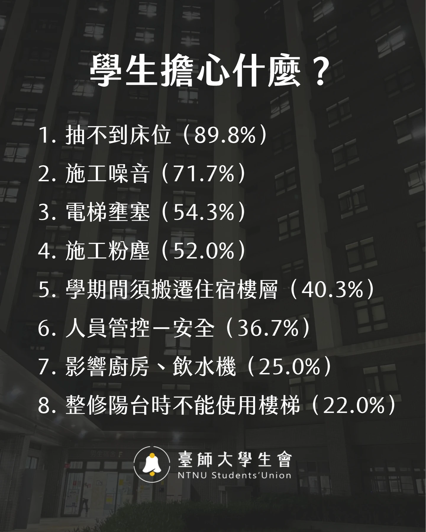 除床位問題外,台師大學生會指出,學生也對施工期間的生活品質表達憂慮,像是學生擔心施工帶來噪音影響作息71.1%、電梯壅塞54.3%、粉塵帶來不適52.0%、需於學期間搬遷至其他樓層40.3%等。