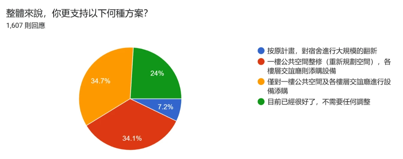 調查結果指出,僅7.2%學生支持原計畫,若僅計算居住於學二舍的學生,支持比例更僅有5.4%,多數學生對施工可能帶來的影響深感憂慮,有超過千位學生、89.8%擔心施工後將更難抽中床位。