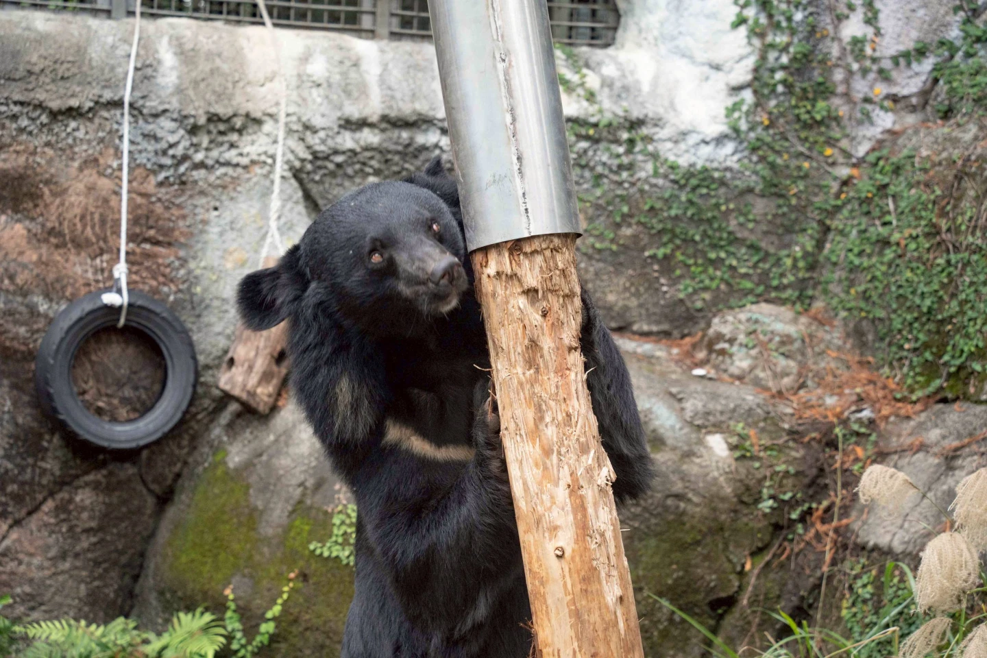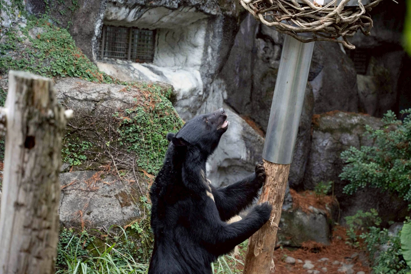 不是工讀生!台北動物園新設施 黑熊「黑輪」站立抱樹搖晃超萌