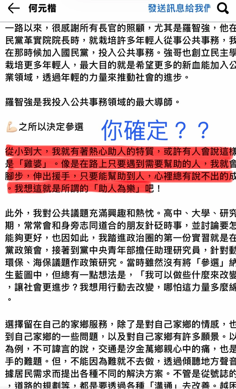 他看到何元楷臉書上寫著「從小到大,我就有著熱心助人的特質,或許有人會說這樣是『雞婆』。像是在路上只要遇到需要幫助的人,我就會伸出援手。」讓他覺得傻眼。他在何元楷貼文底下留言並私訊,最後換來的是「封鎖」。「那讓我明白,在他的世界裡,那些行為他沒打算面對。」